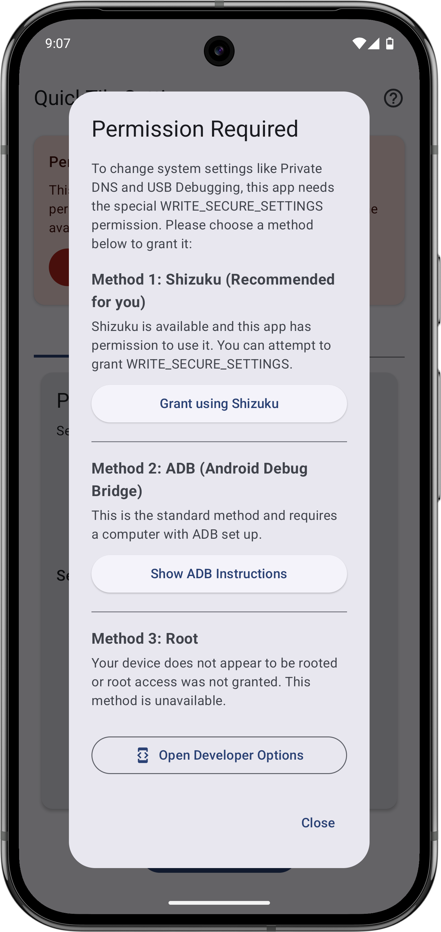 - Grant ADB permission: Follow the in-app instructions for a one-time setup.