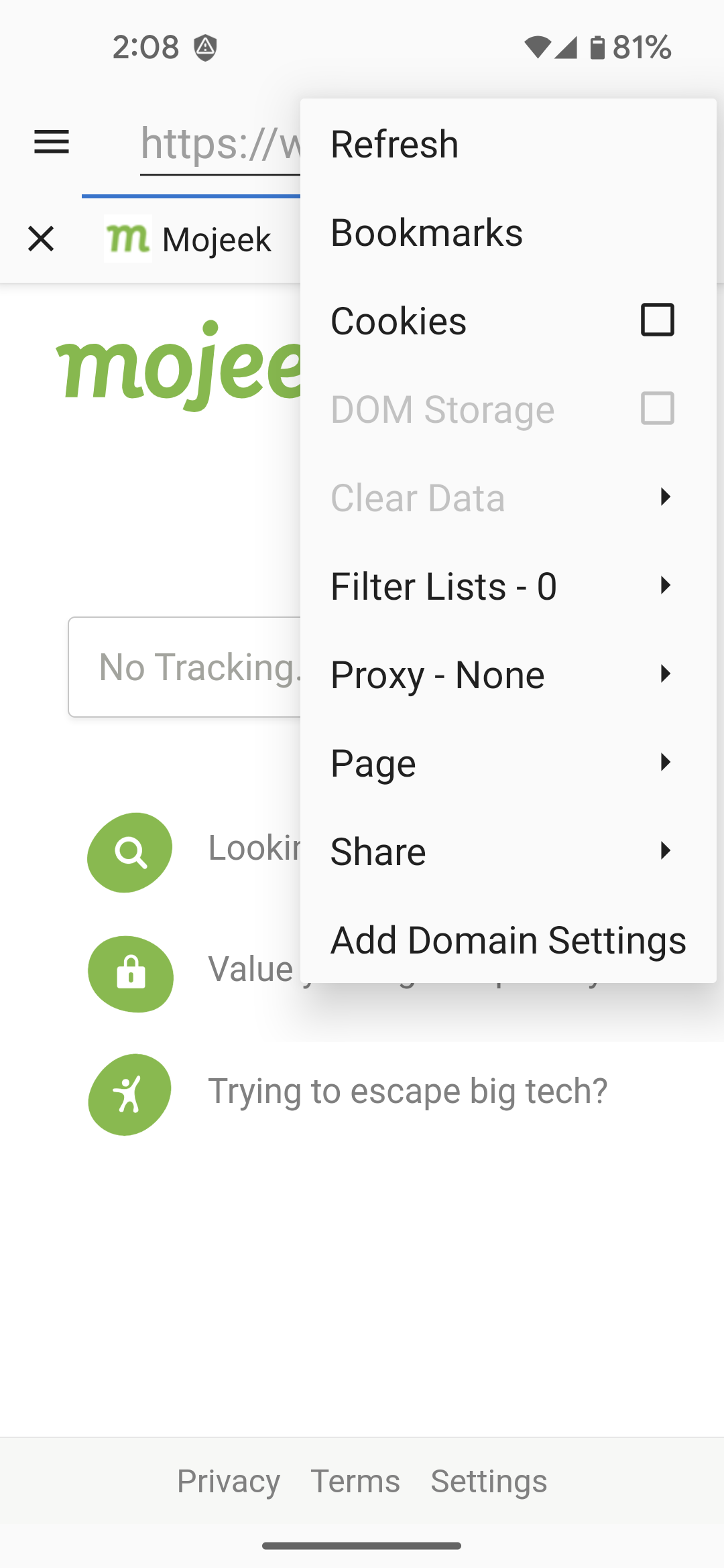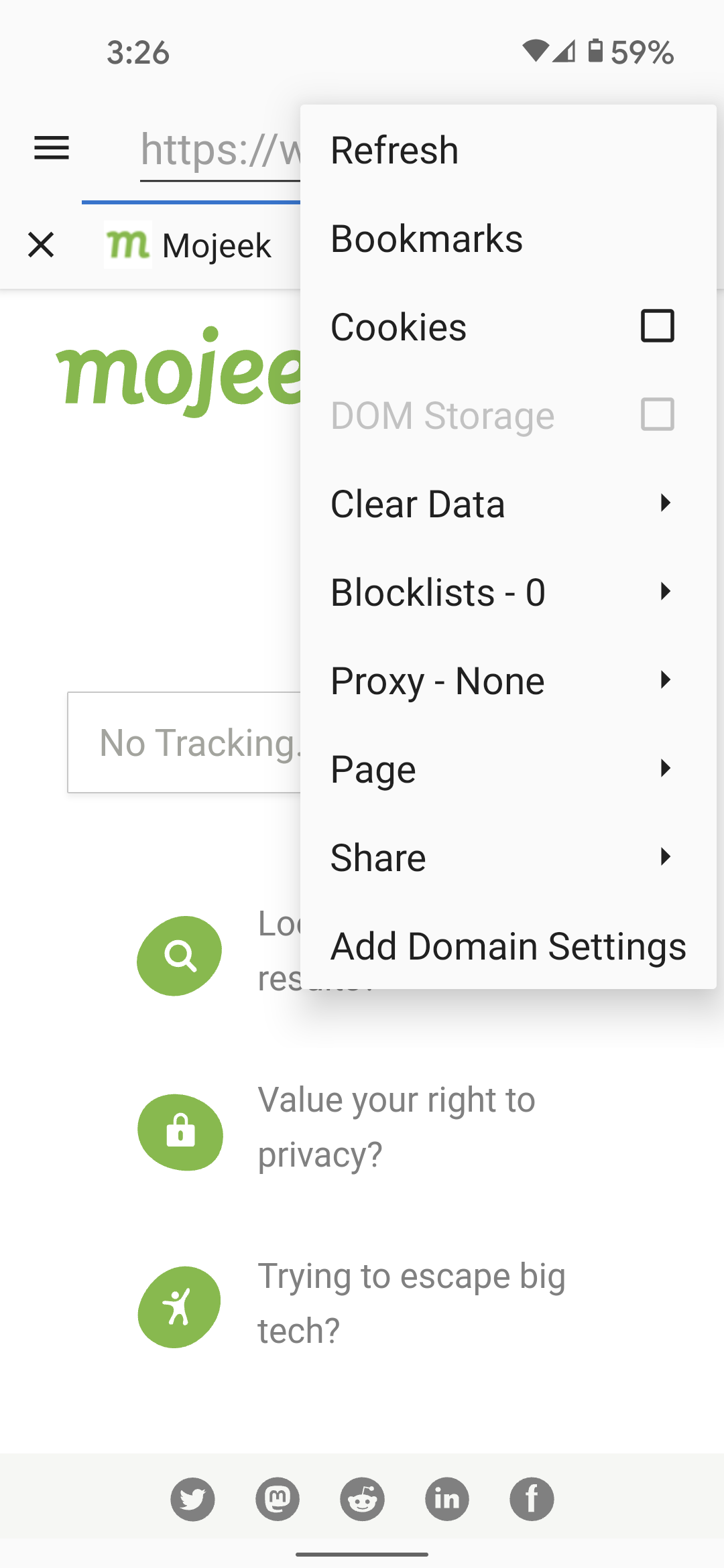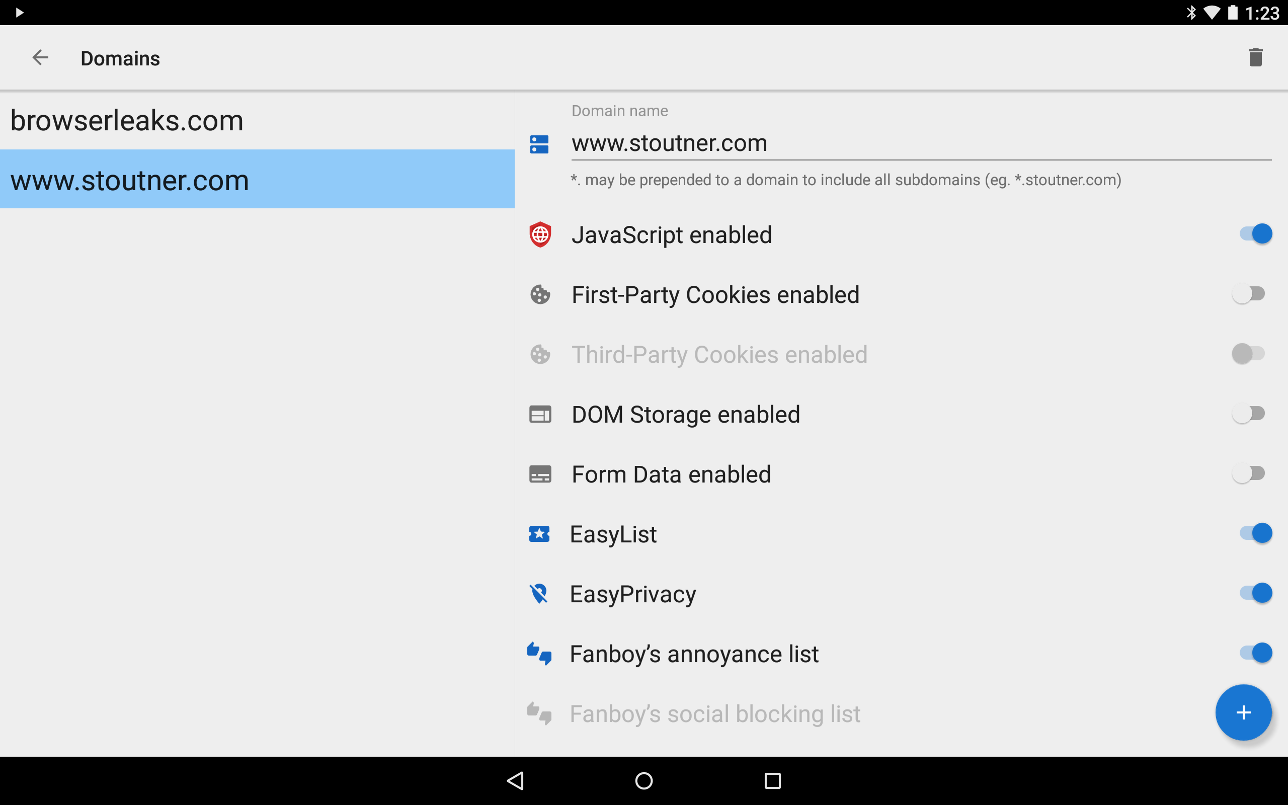 In contrast, privacy sensitive features are disabled by default in Privacy Browser. If one of these technologies is required for a website to function correctly, the user may choose to turn it on for just that visit. Or, they can use domain settings to automatically turn on certain features when entering a specific website and turn them off again when leaving.