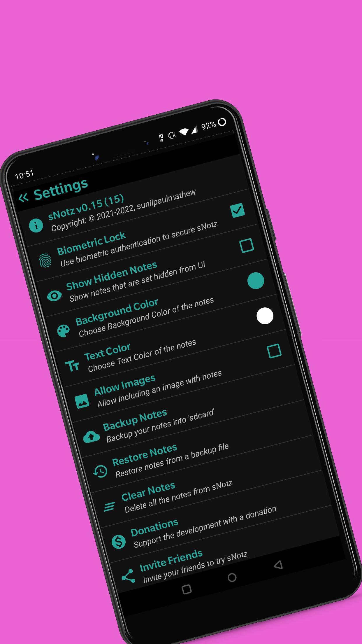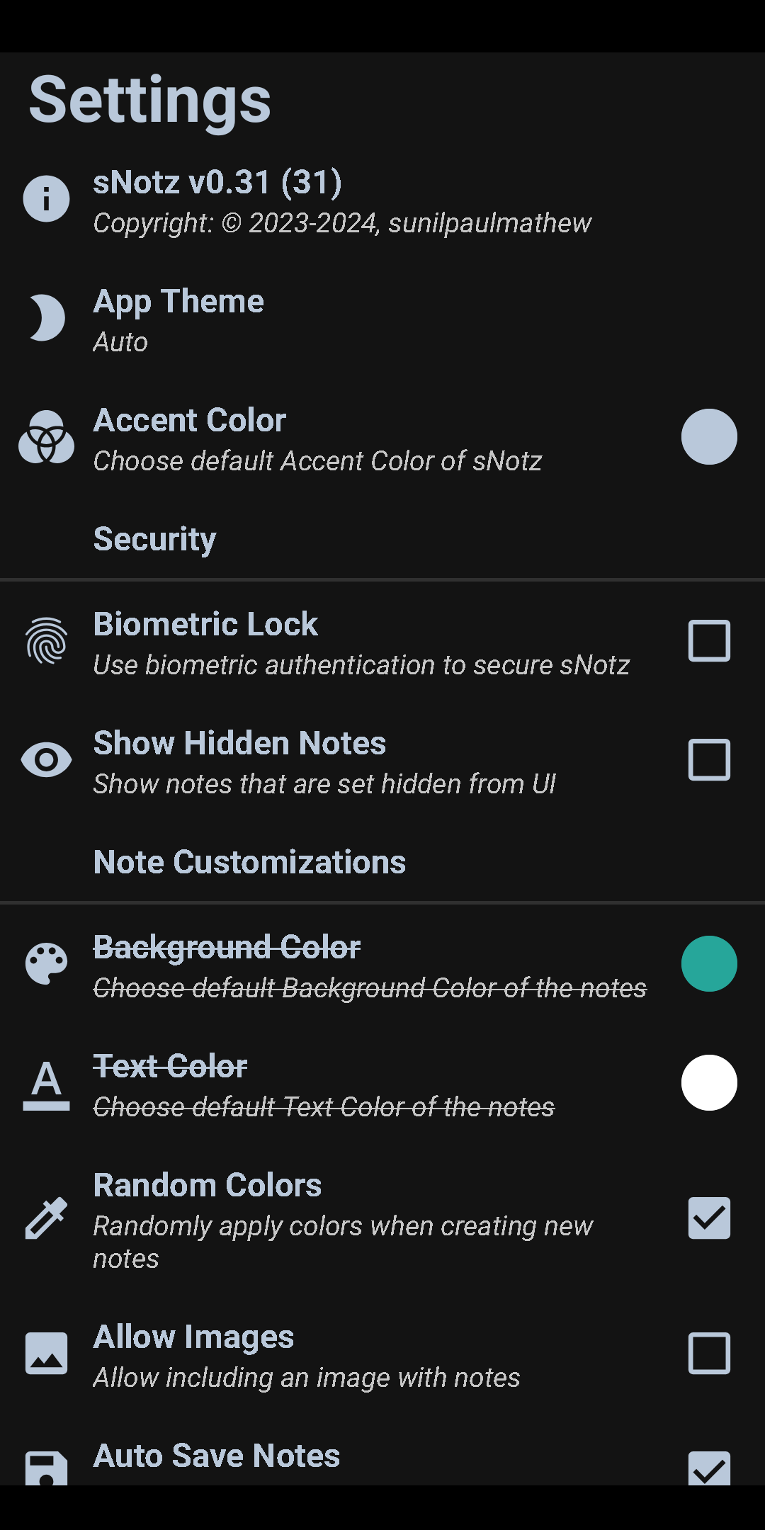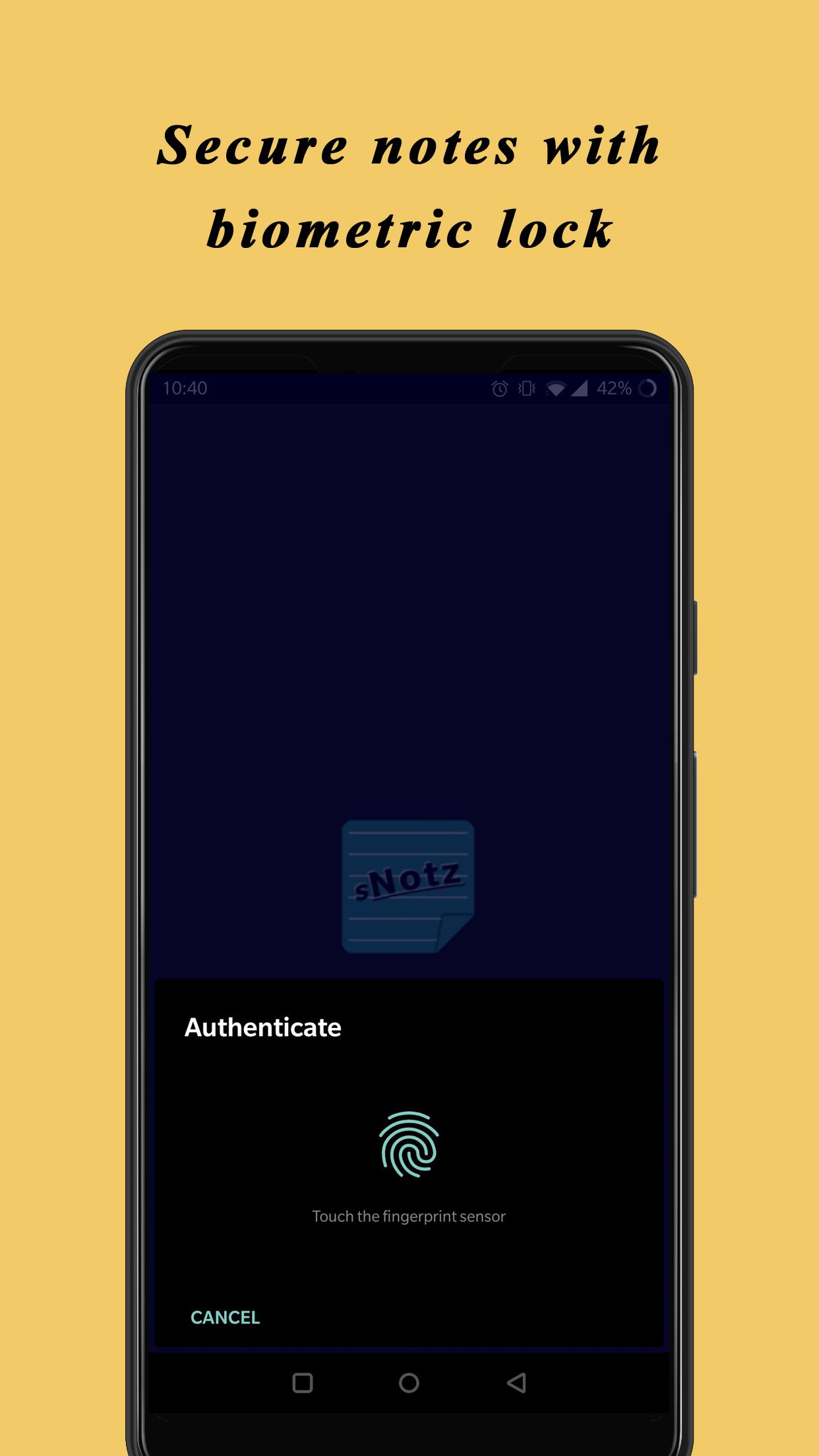 sNotz is an open-source, privacy-friendly, secure, and completely offline application, which will let you create, customize, and manage simple notes on your android device.