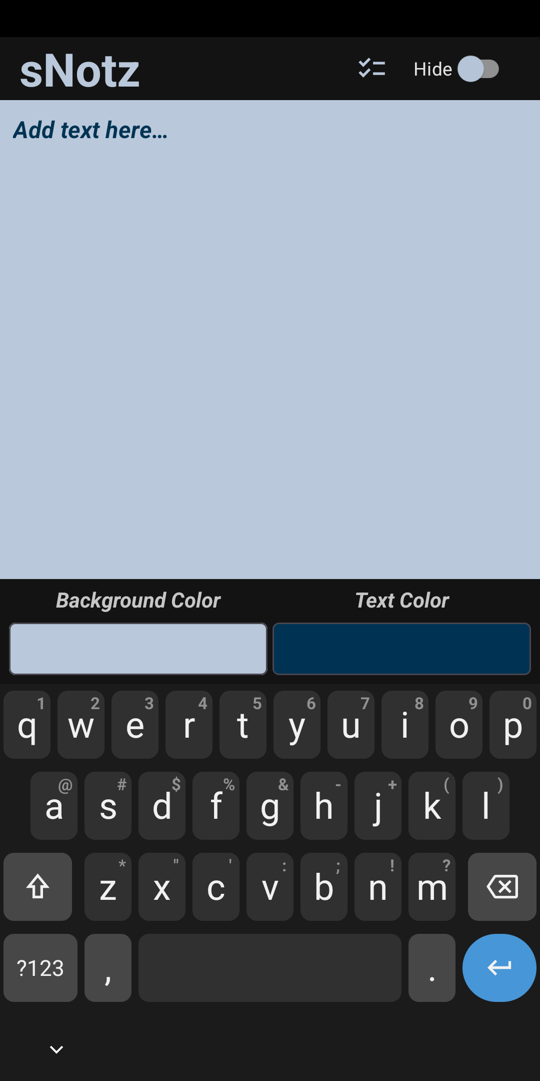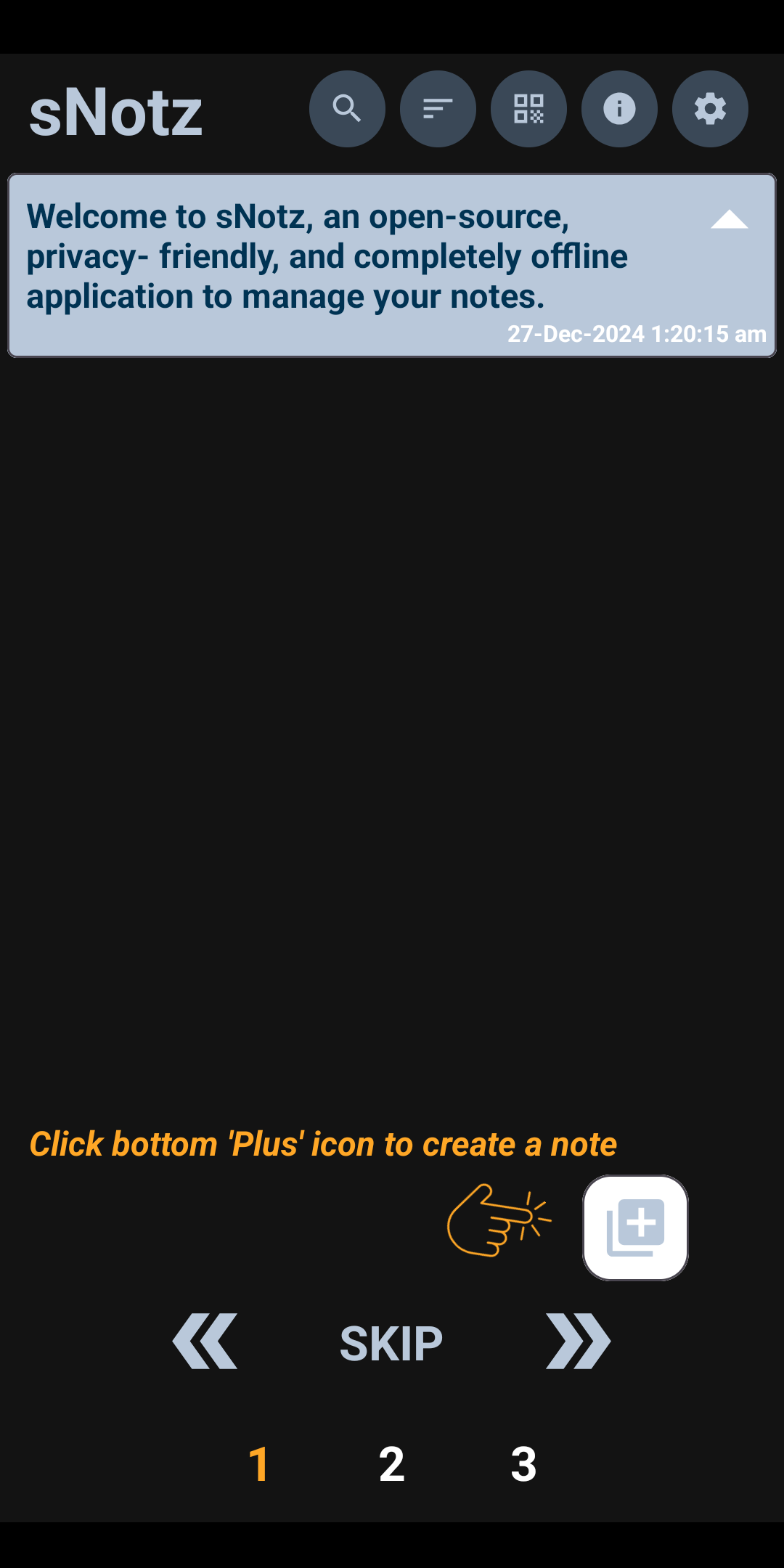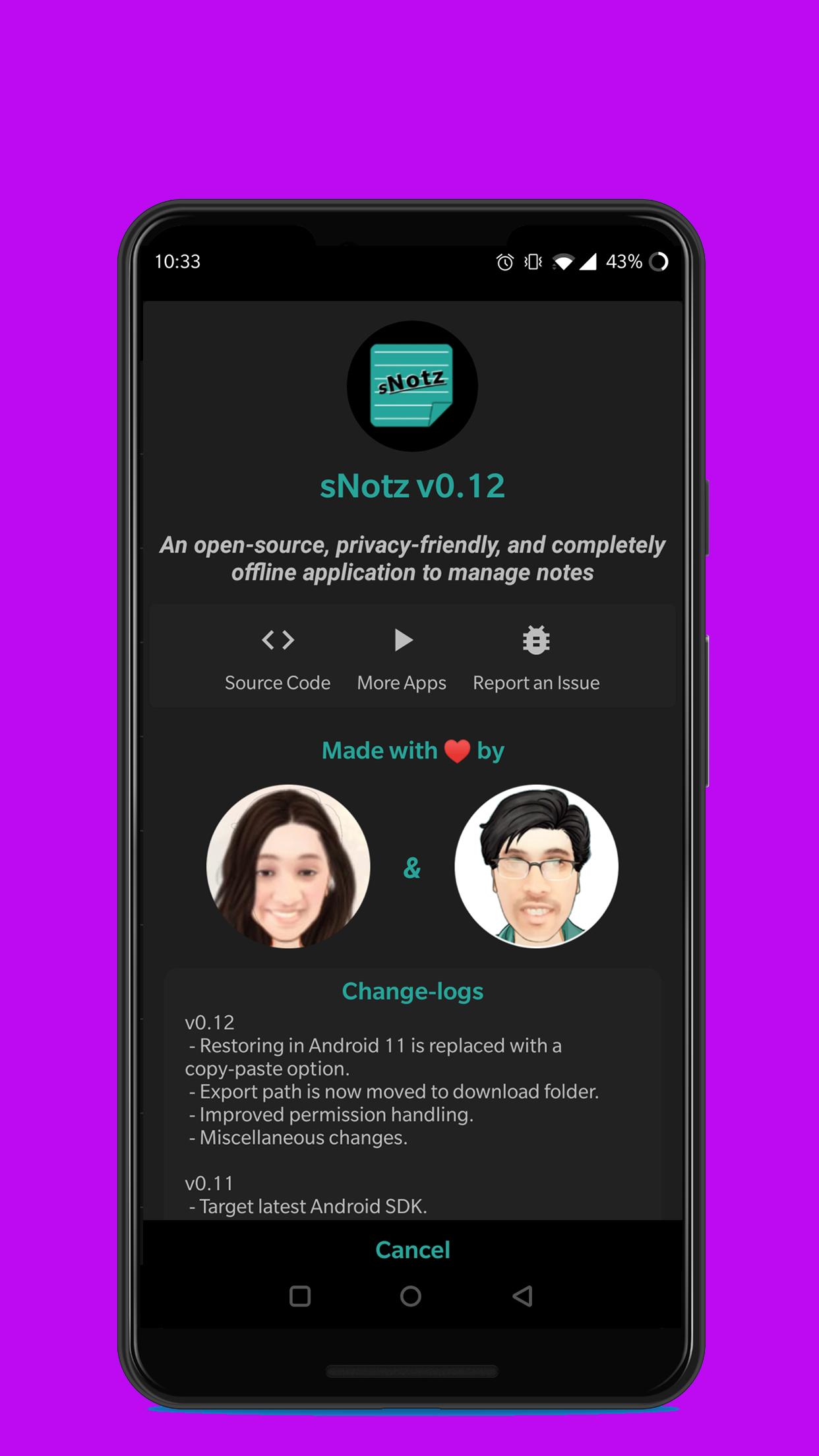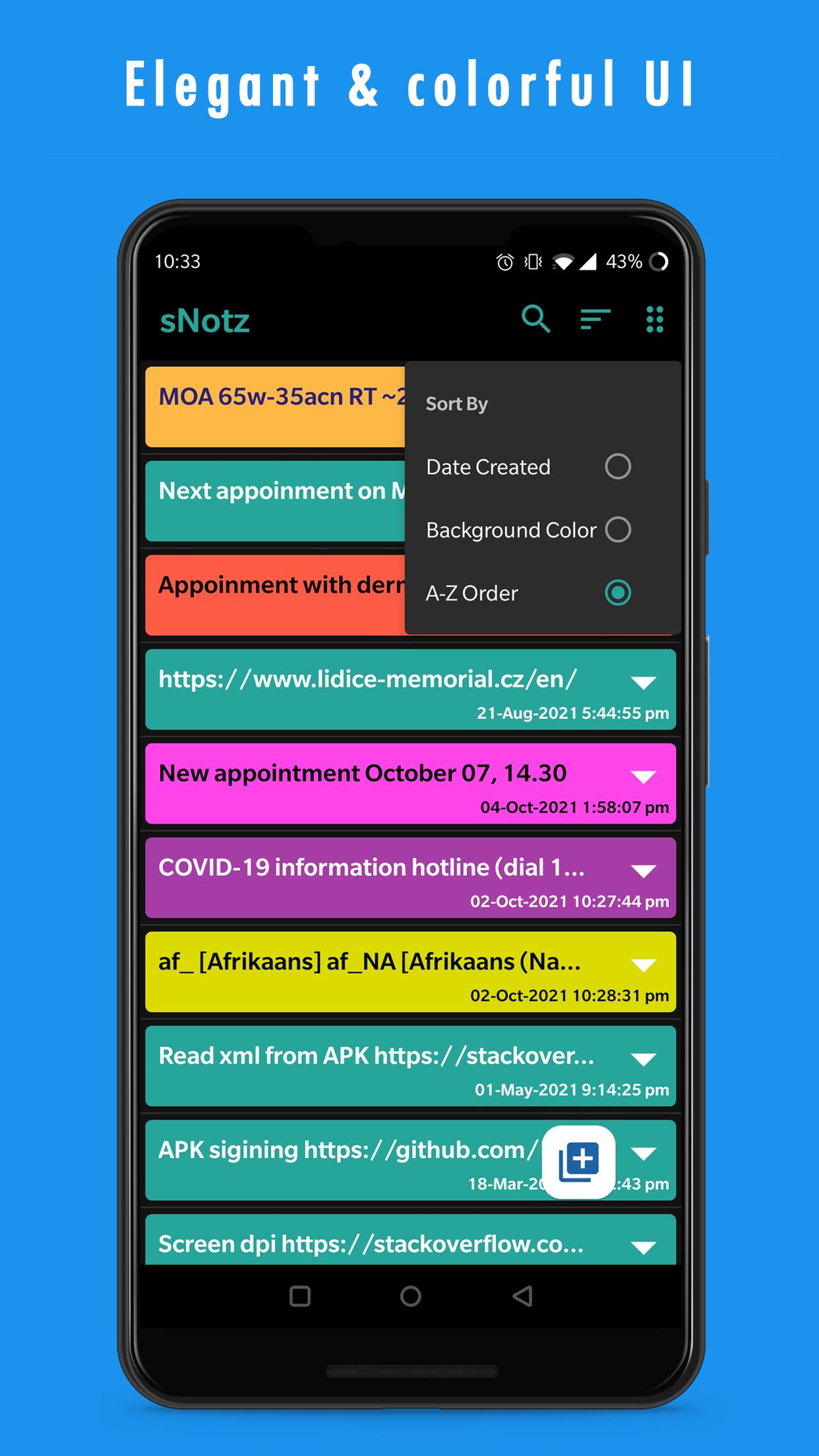 sNotz is an open-source, privacy-friendly, secure, and completely offline application, which will let you create, customize, and manage simple notes on your android device.