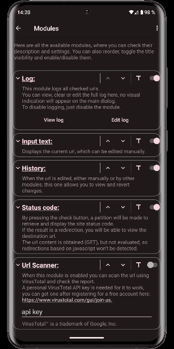 URLCheck is developed by TrianguloY, originally for personal use. It is open source (under CC BY 4.0 license), free, without any ads or trackers, light sized and using as few permissions as necessary (only the internet permission, for module checks that will only be performed when the user request them). The source code is available on GitHub too, if you want to suggest changes, perform modifications or propose a new translation: https://github.com/TrianguloY/URLCheck