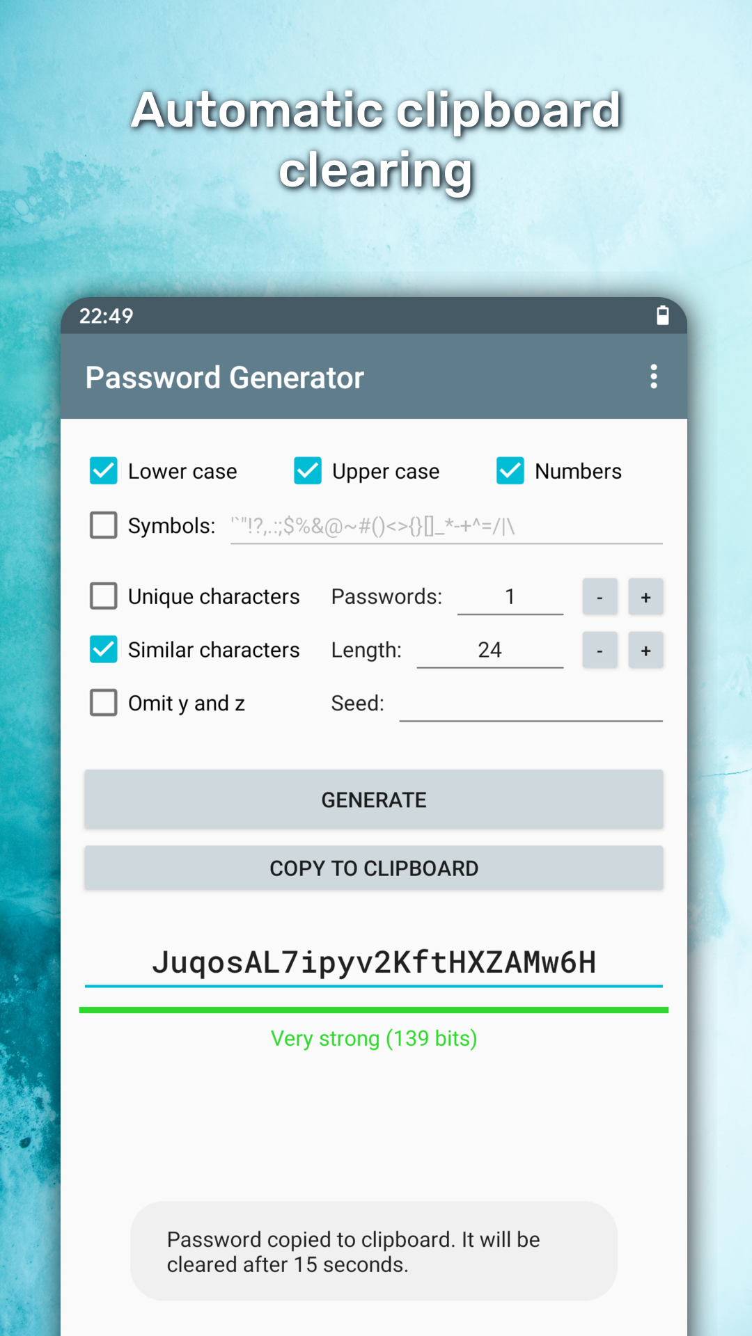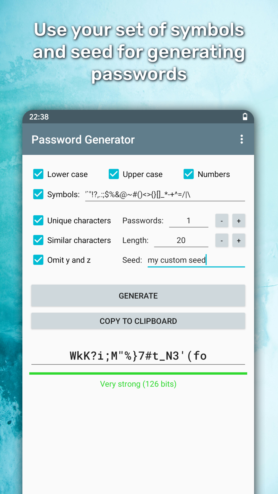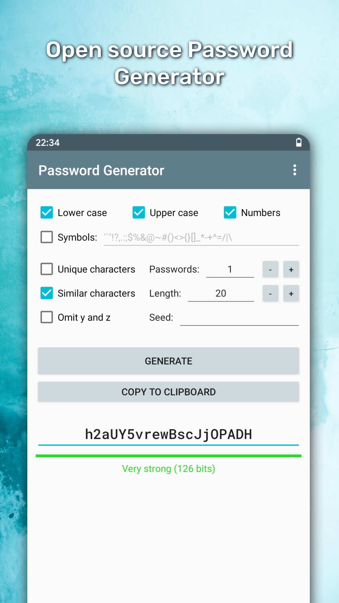 Password Generator is an app for generating secure passwords using cryptographically secure pseudo-random number generator. You are given options to choose which characters your password should contain or you can choose your set of a custom symbols. Generating passwords with Password Generator is fast and easy, just check options and hit a button.