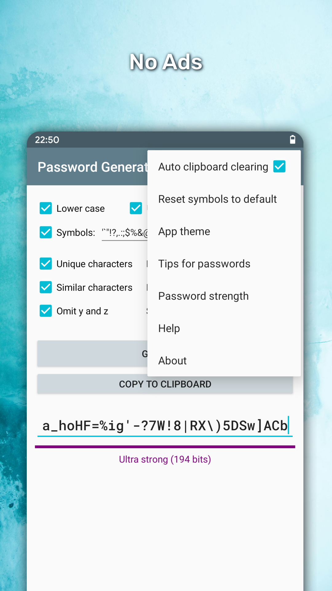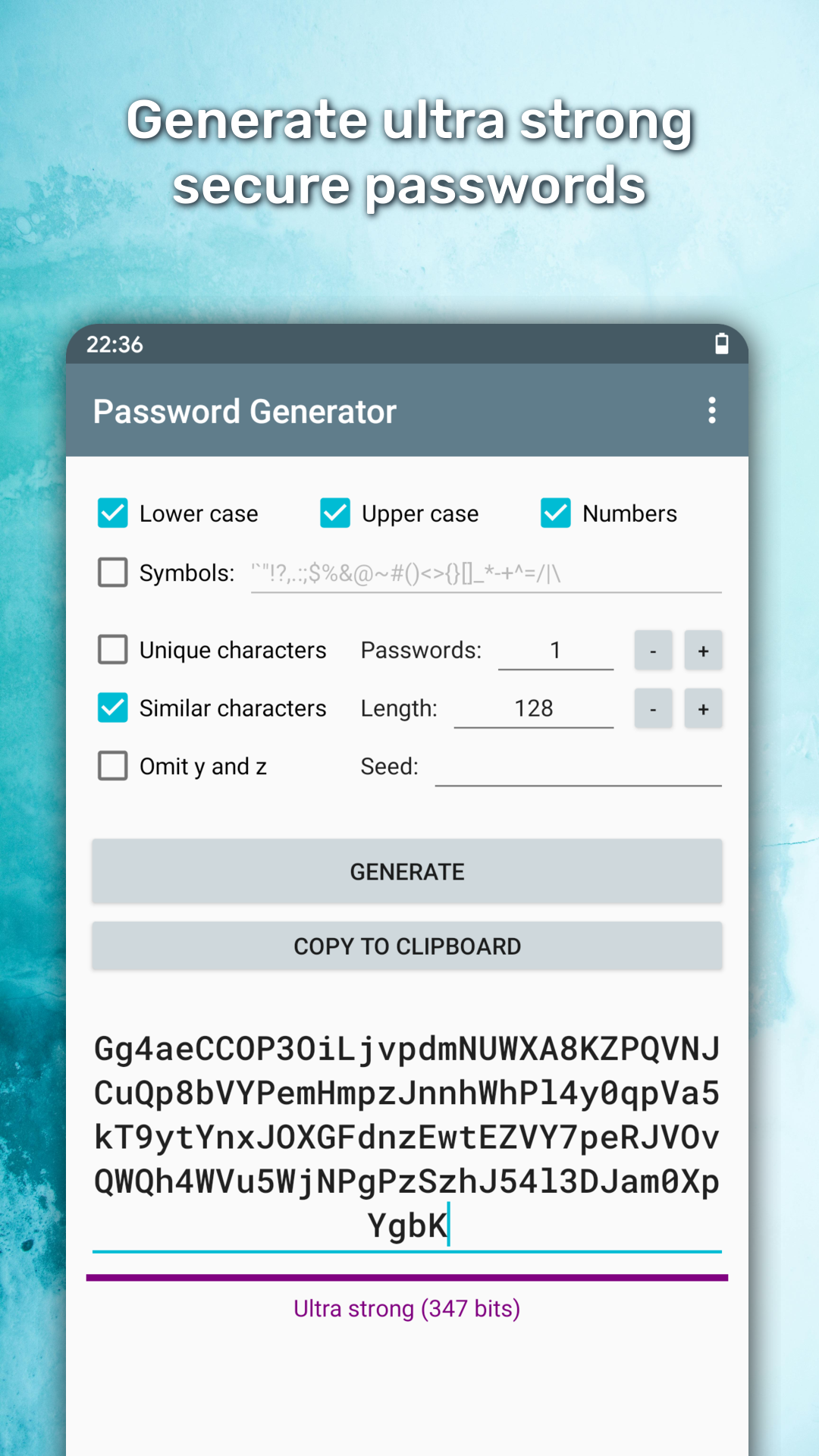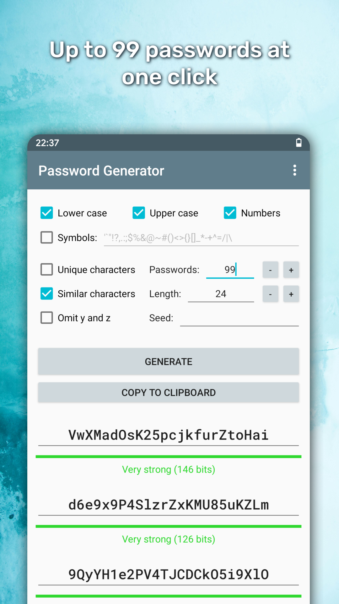 Password Generator is an app for generating secure passwords using cryptographically secure pseudo-random number generator. You are given options to choose which characters your password should contain or you can choose your set of a custom symbols. Generating passwords with Password Generator is fast and easy, just check options and hit a button.