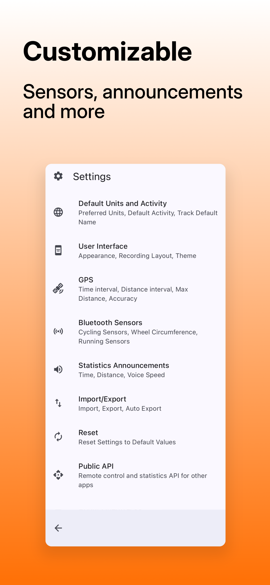 * Supports Bluetooth LE sensors: heart rate, speed and distance (cycling), cadence (cycling), and power meter (cycling).
