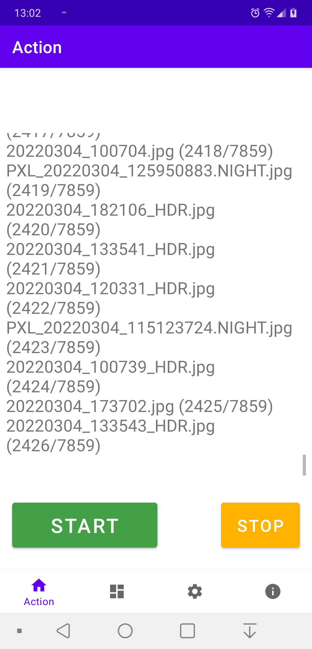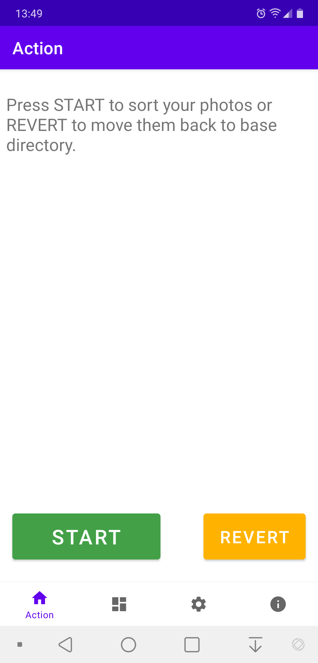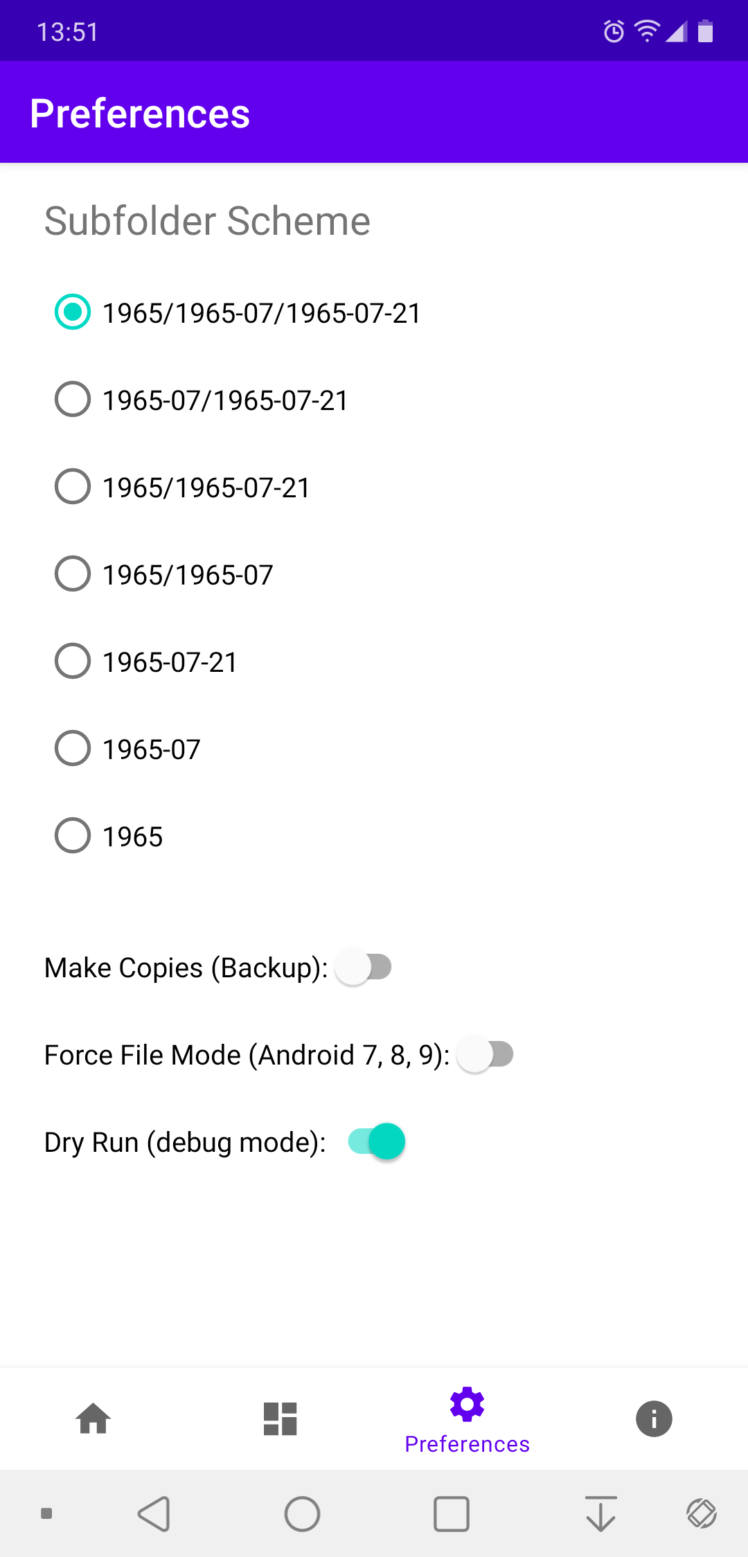 Sorts all photos, located in the device's camera folder, into a date specific subfolder structure. This makes it easier to transfer specific photos to a computer, e.g. via USB cable (MTP protocol).