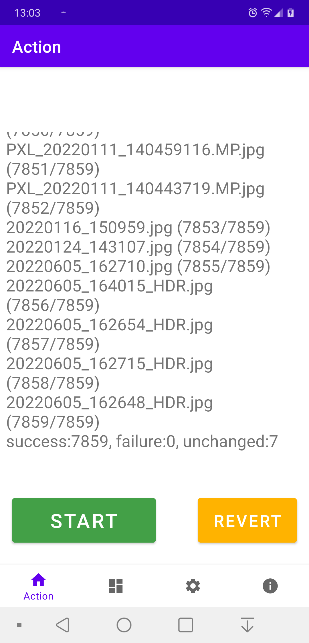 On the demand a file name prefix like "IMG_" or "PXL_" can be appended instead or completely removed. Note that this operation is not revertible.