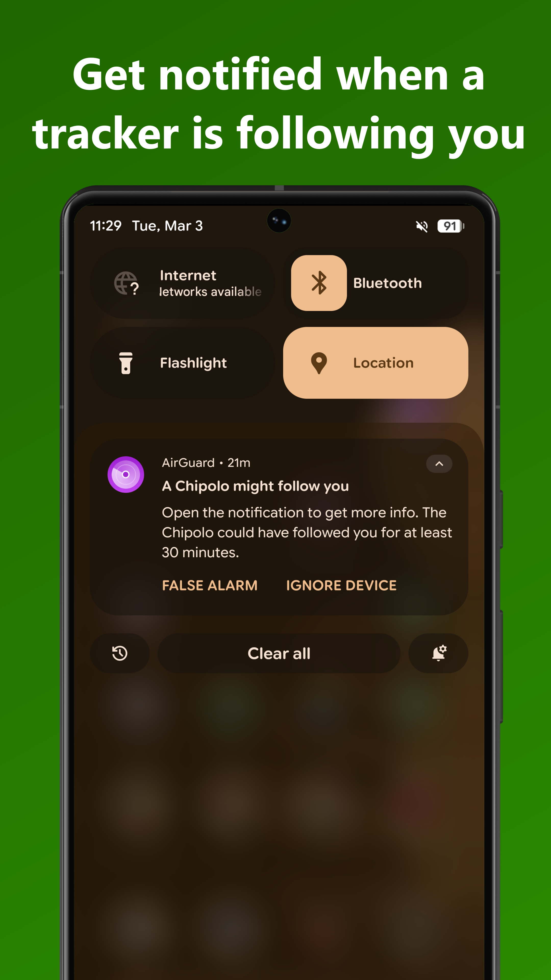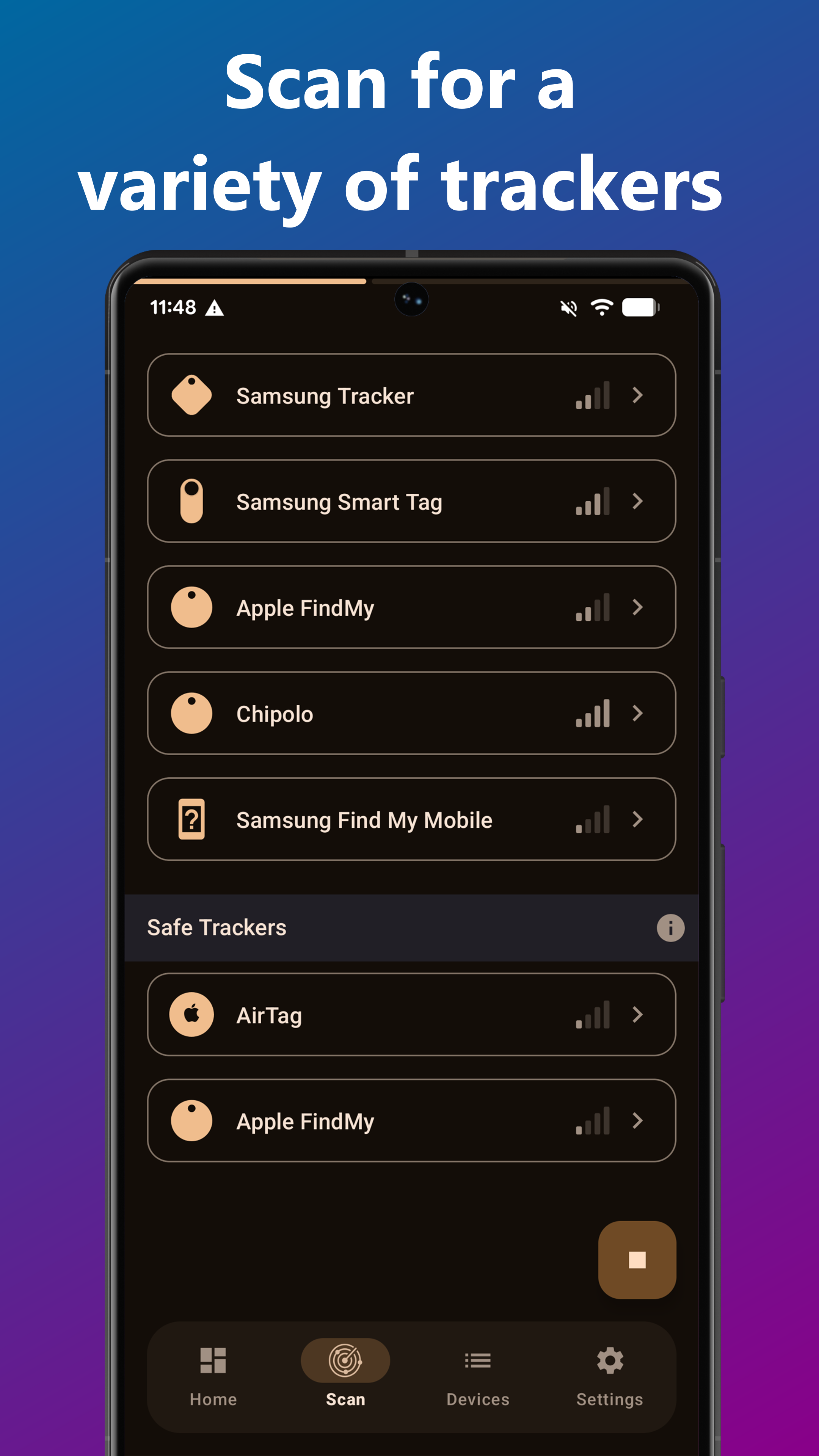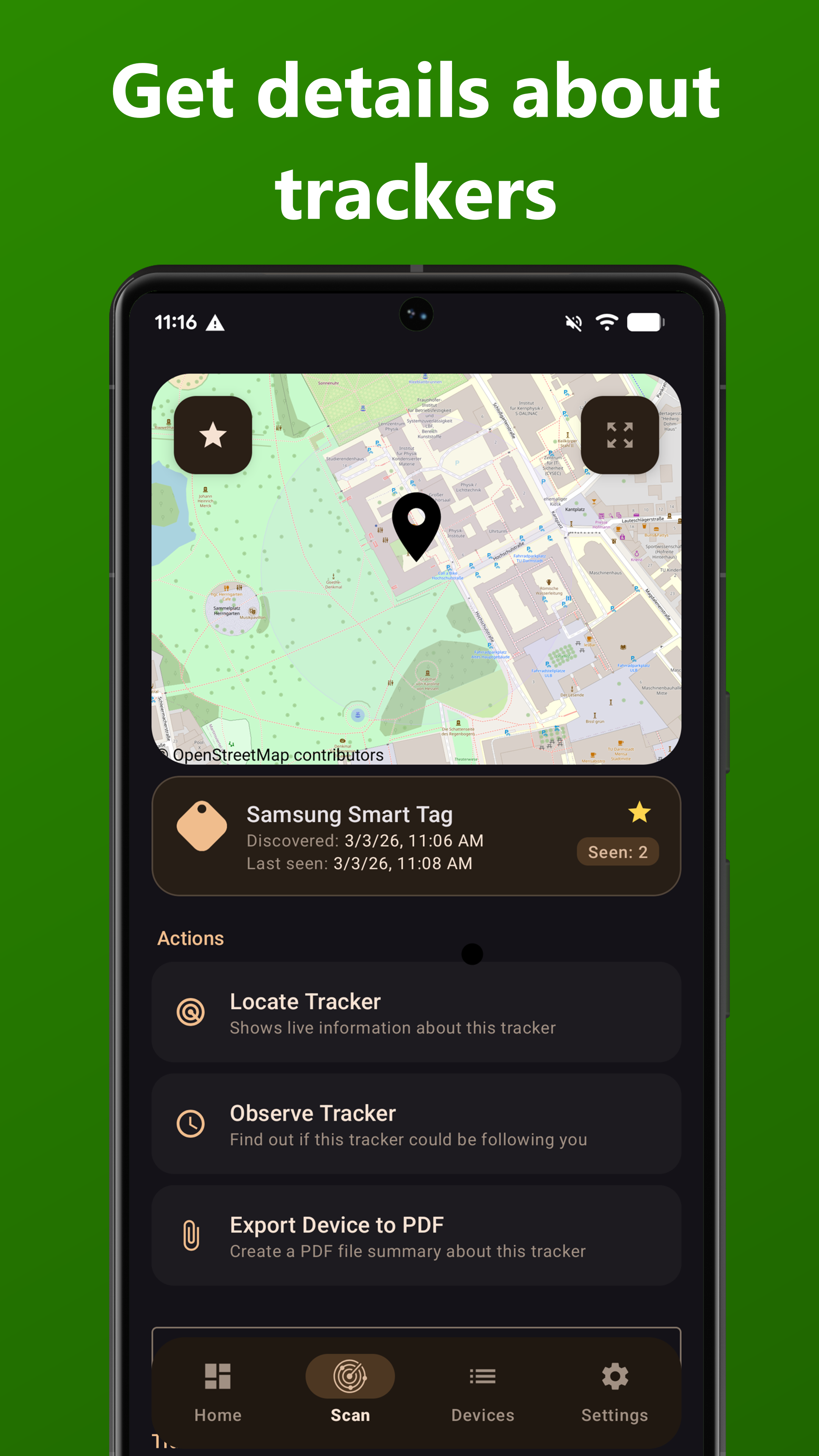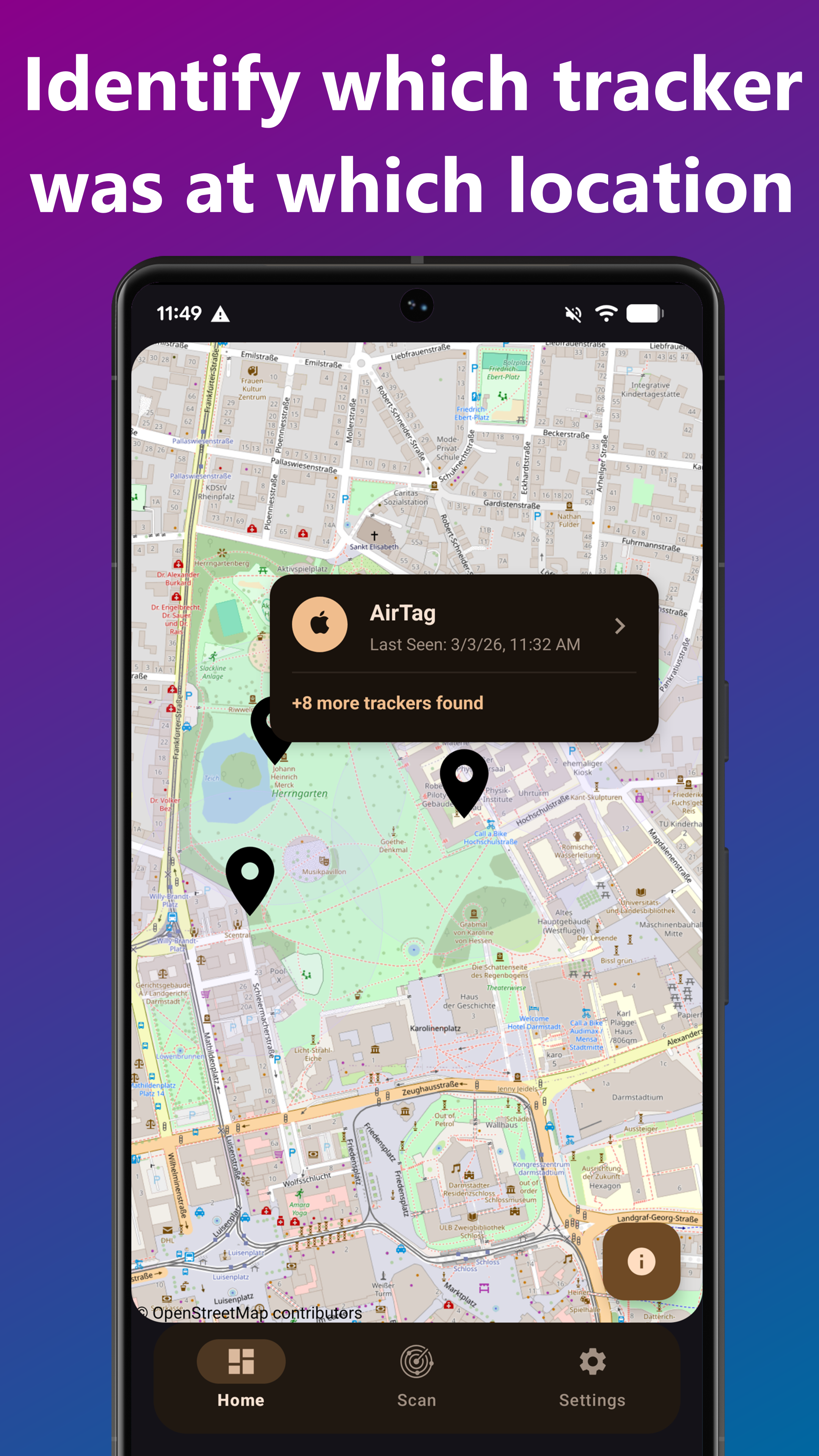 The app scans your surroundings in the background to detect trackers like AirTags, Samsung SmartTags, or Google Find My Device trackers. If a tracker is following you, you will receive an instant notification.