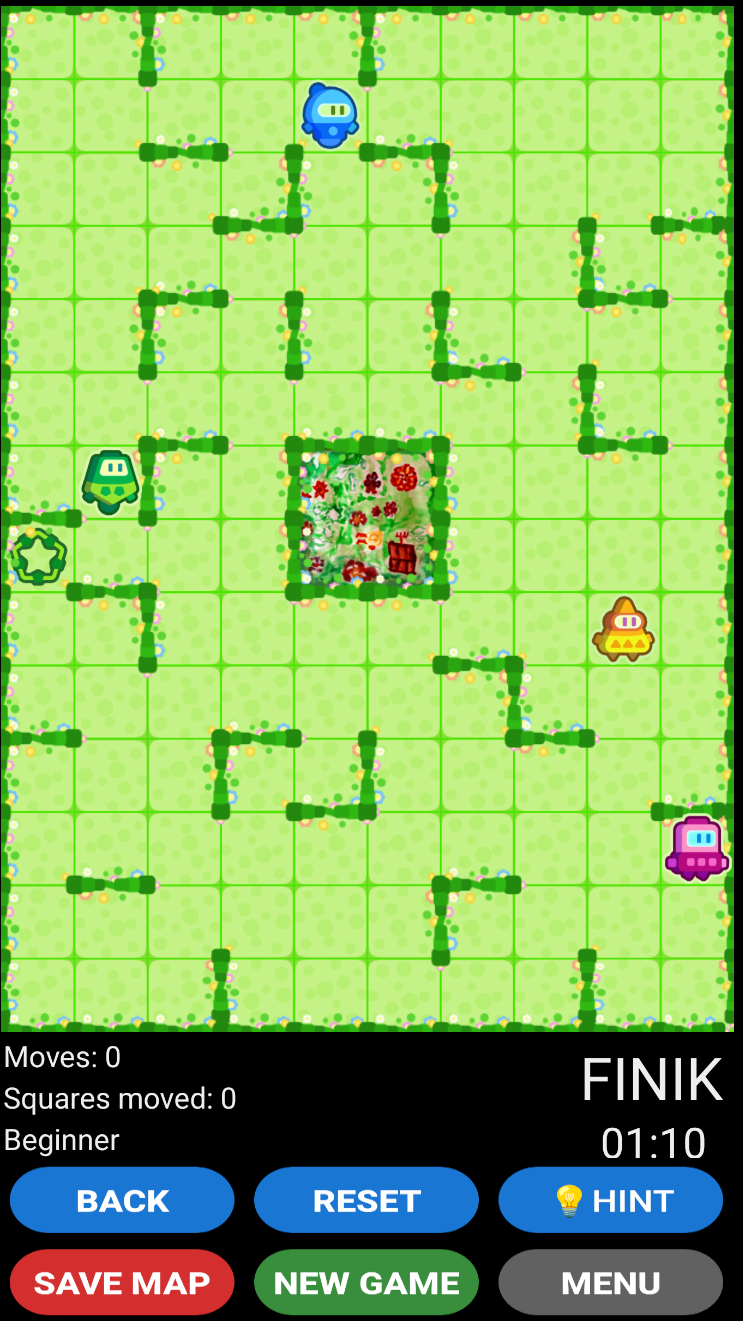 You control four robots in a yard full of hedges, that block their way. The goal is to guide a particular robot to its destination. The robots move until they either hit a hedge or another robot.
