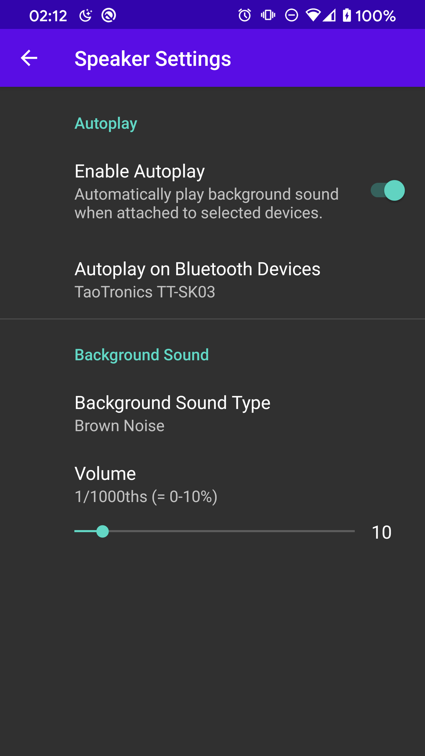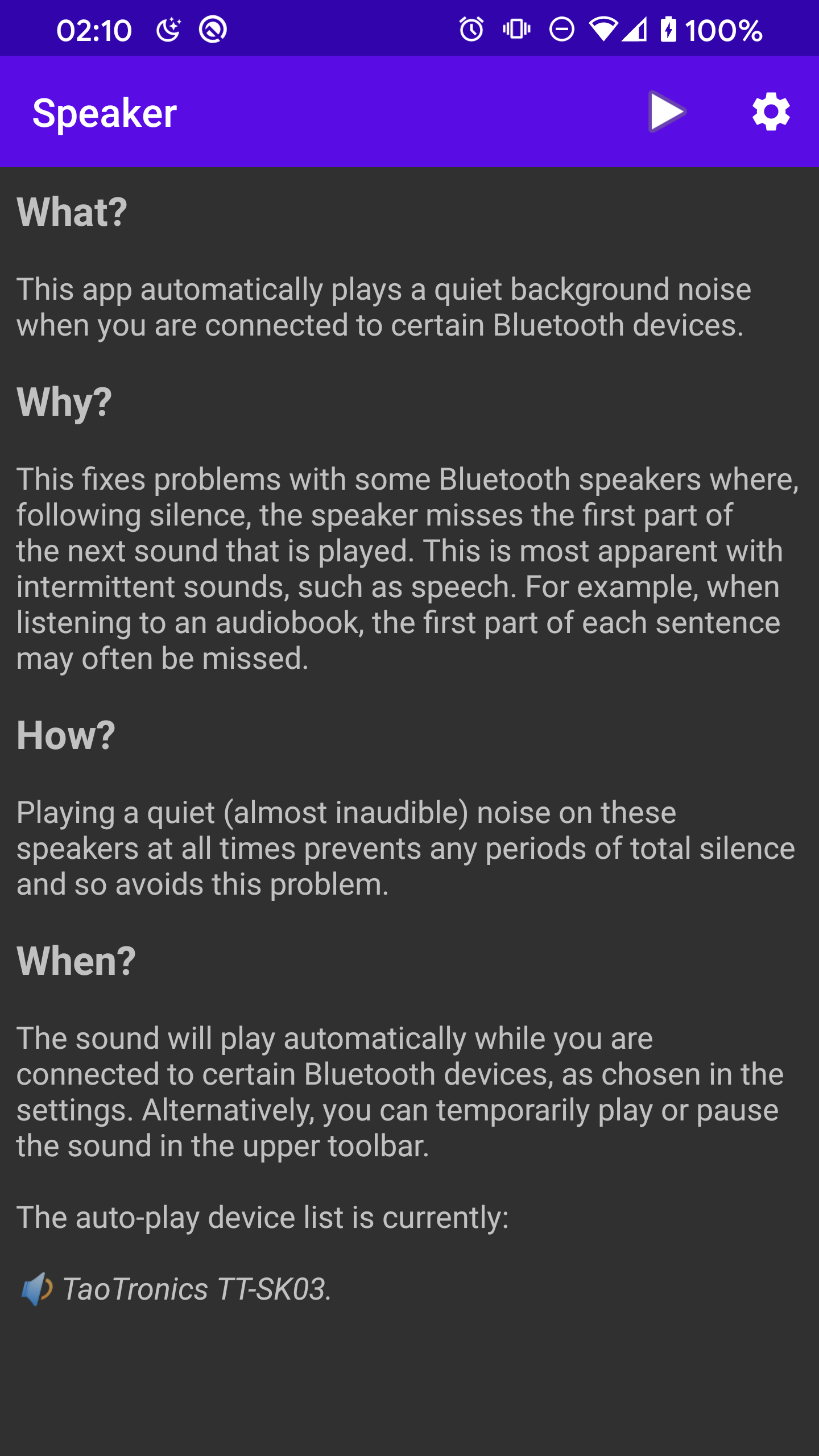 This app automatically plays a quiet background noise when connected to specific Bluetooth devices.