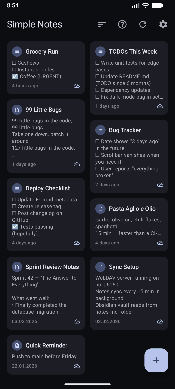 Key Features: * Text notes and checklists (tap-to-check, drag & drop, sorting) * Grid and list view with note type indicators * Homescreen widgets (quick-note, checklist with interactive checkboxes) * Multi-device sync (phone, tablet, desktop) * WebDAV sync with your own server (Nextcloud, ownCloud, etc.) * Markdown export/import for desktop editors (Obsidian, VS Code) * WiFi-only sync, VPN support, parallel downloads * Configurable sync triggers: onSave, onResume, WiFi, periodic, boot * Fully usable offline – no ads, no trackers