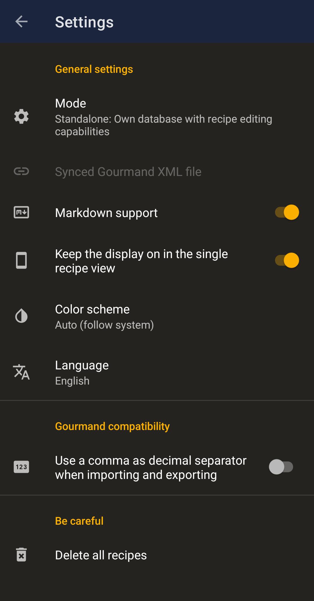 📦 Export and share recipes as JSON files or ZIP archive with friends or use the Gourmand XML format
