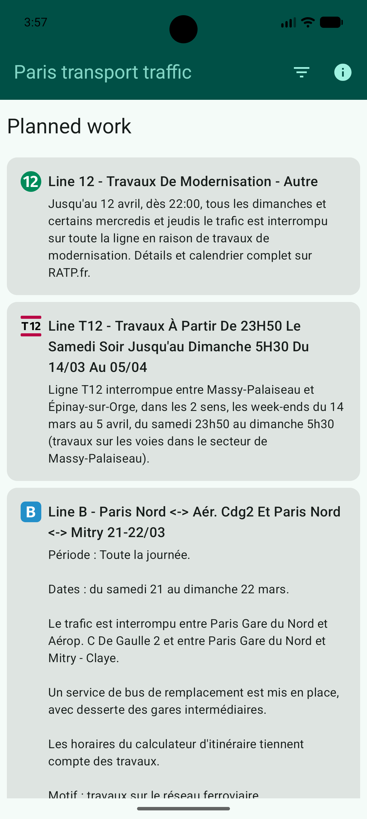 This application allows you to consult various traffic information for different RATP/SNCF transport services (for Paris and the suburbs) :