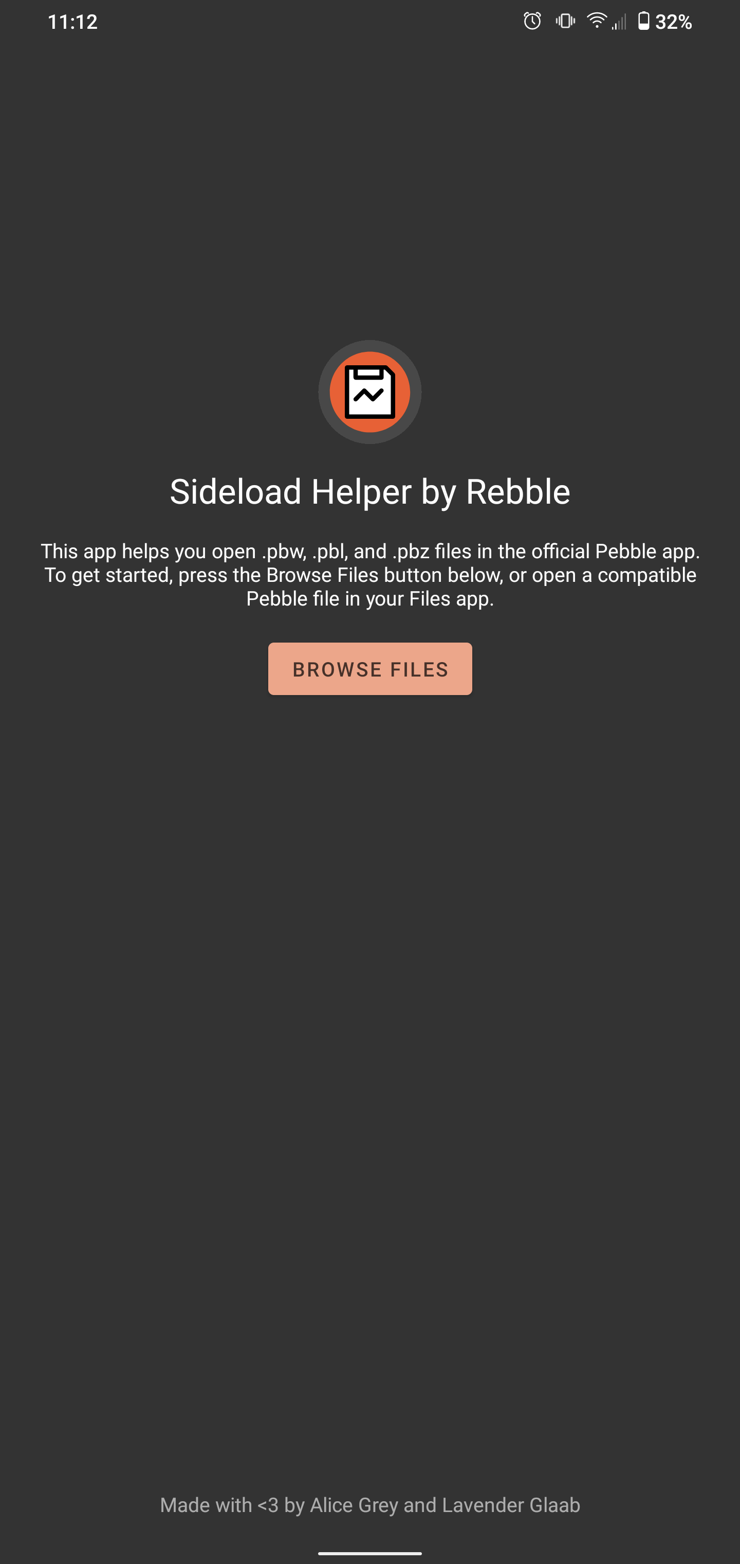 Sideload Helper by Rebble helps you sideload Pebble watch files (.pbw, .pbl, and .pbz) and Pebble Store links into the official Pebble app.