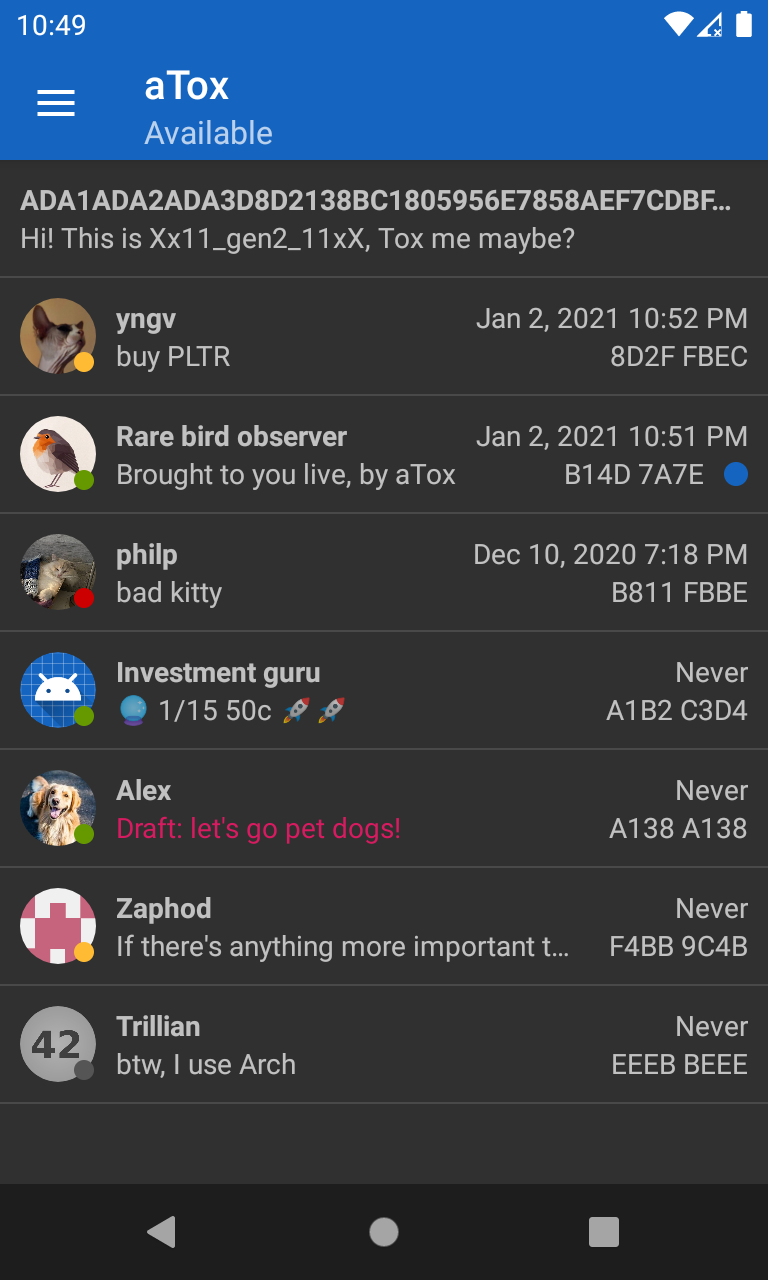 aTox is a free open-source messaging app for the Tox protocol.WhatsNew: