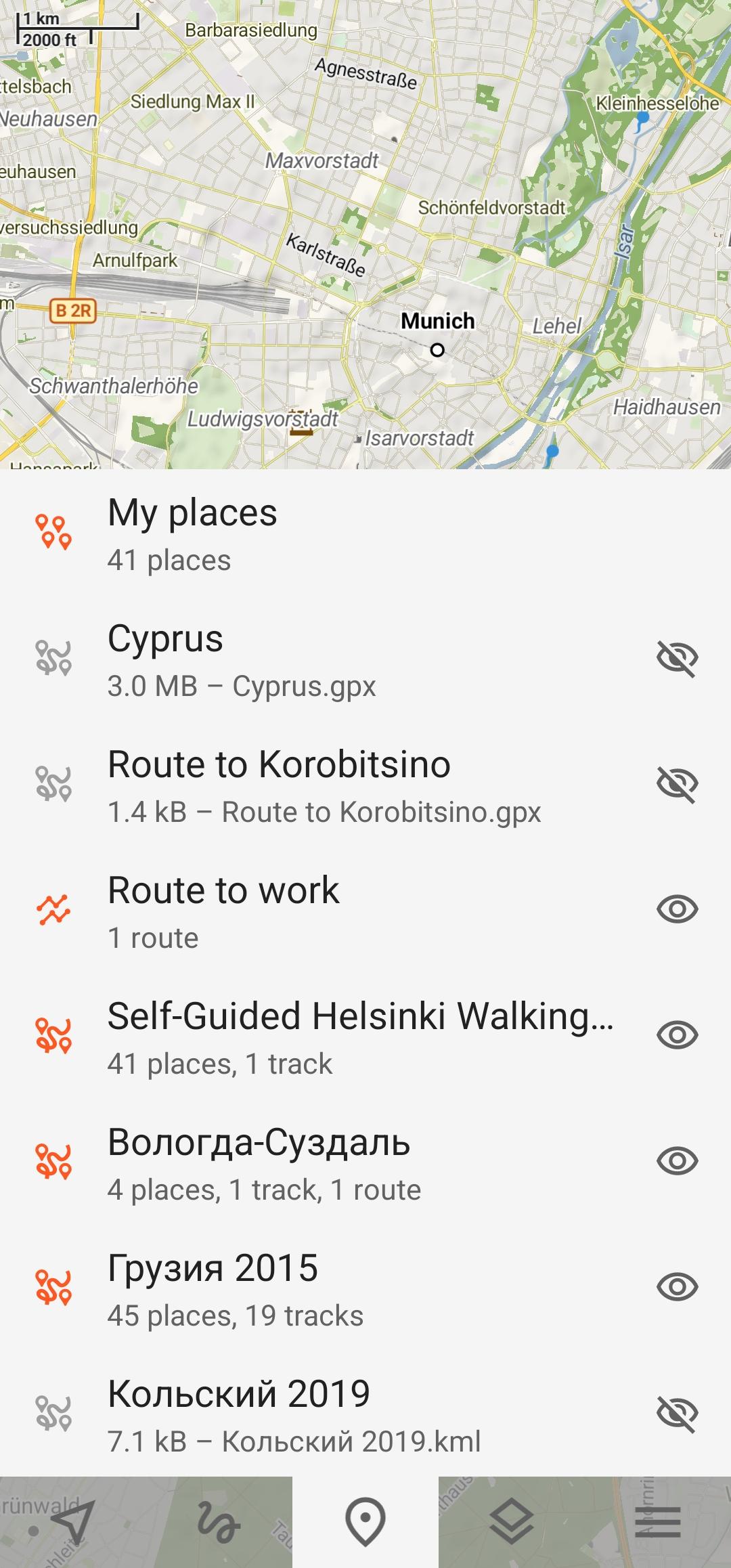 PlacesPlaces can be easily imported from GPX and KML files or can be created within application. You can navigate to places and share them with others.