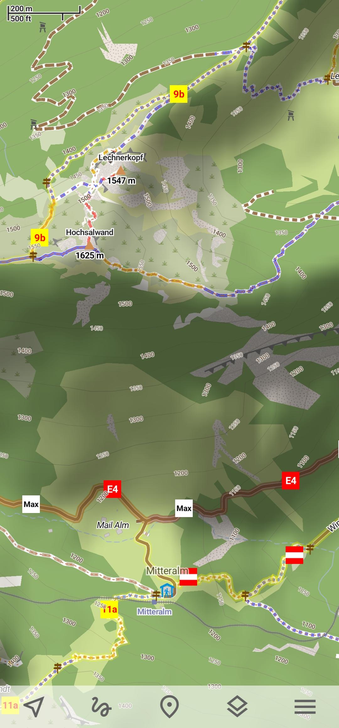 HikingSpecial hiking activity mode emphasises paths and tracks on map. It visualizes path difficulty and visibility and displays hiking routes. It also displays special OSMC symbols that help you identify desired route.