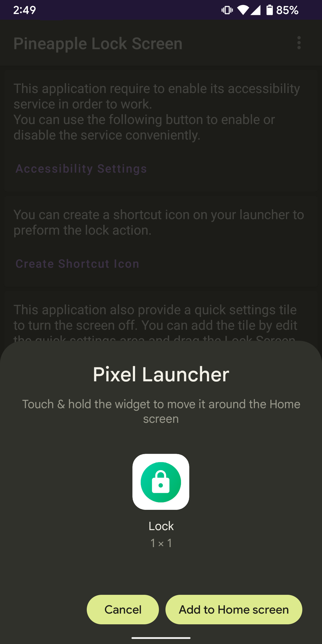 Pineapple Lock Screen (OSS version) is a small, simple, clean, and fast application that helps you turn your phone screen off (lock screen) without using the physical power button. This could help you increase the life of your physical power button, just in case your power physical button is near broken.