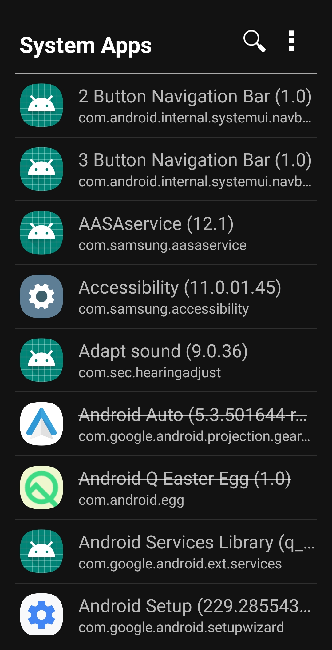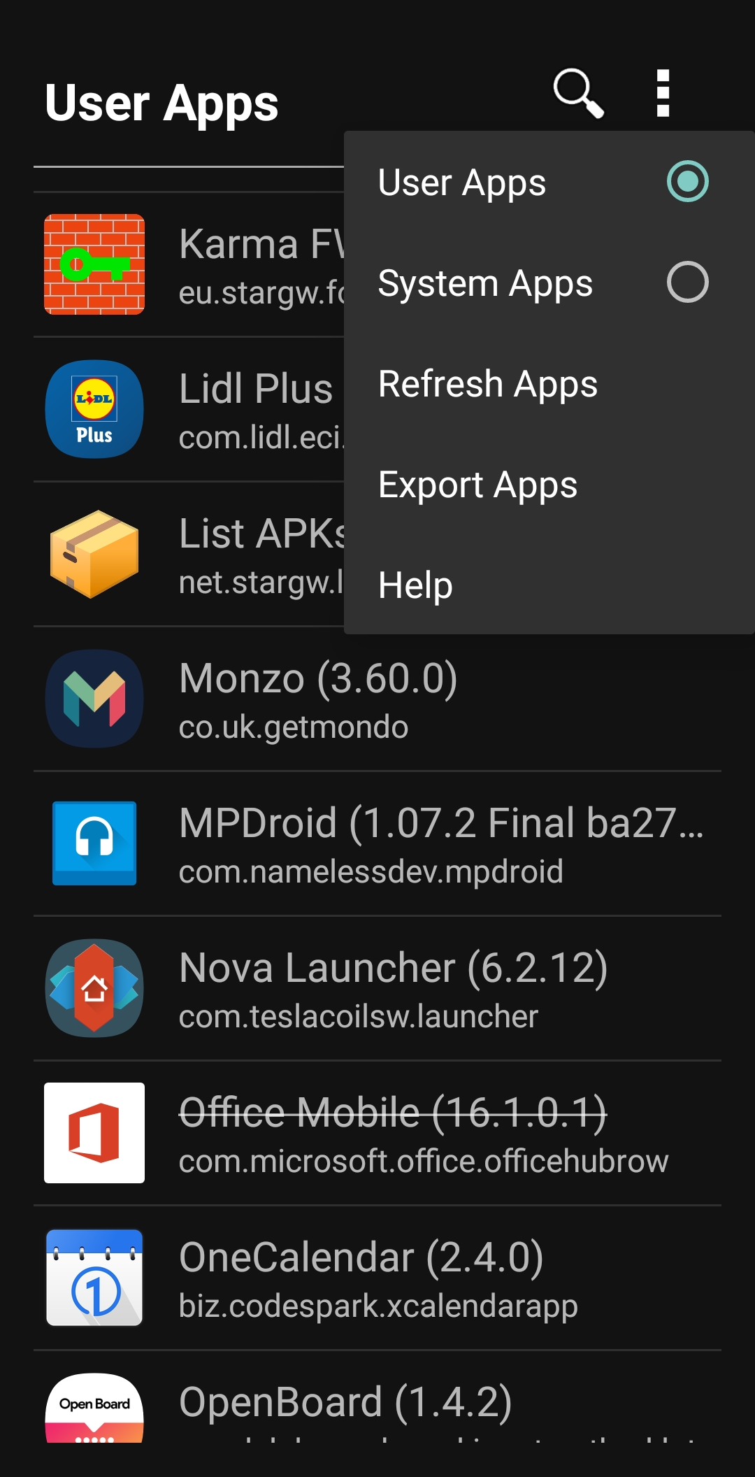 • Long press on icon or app name to copy package name to clipboard