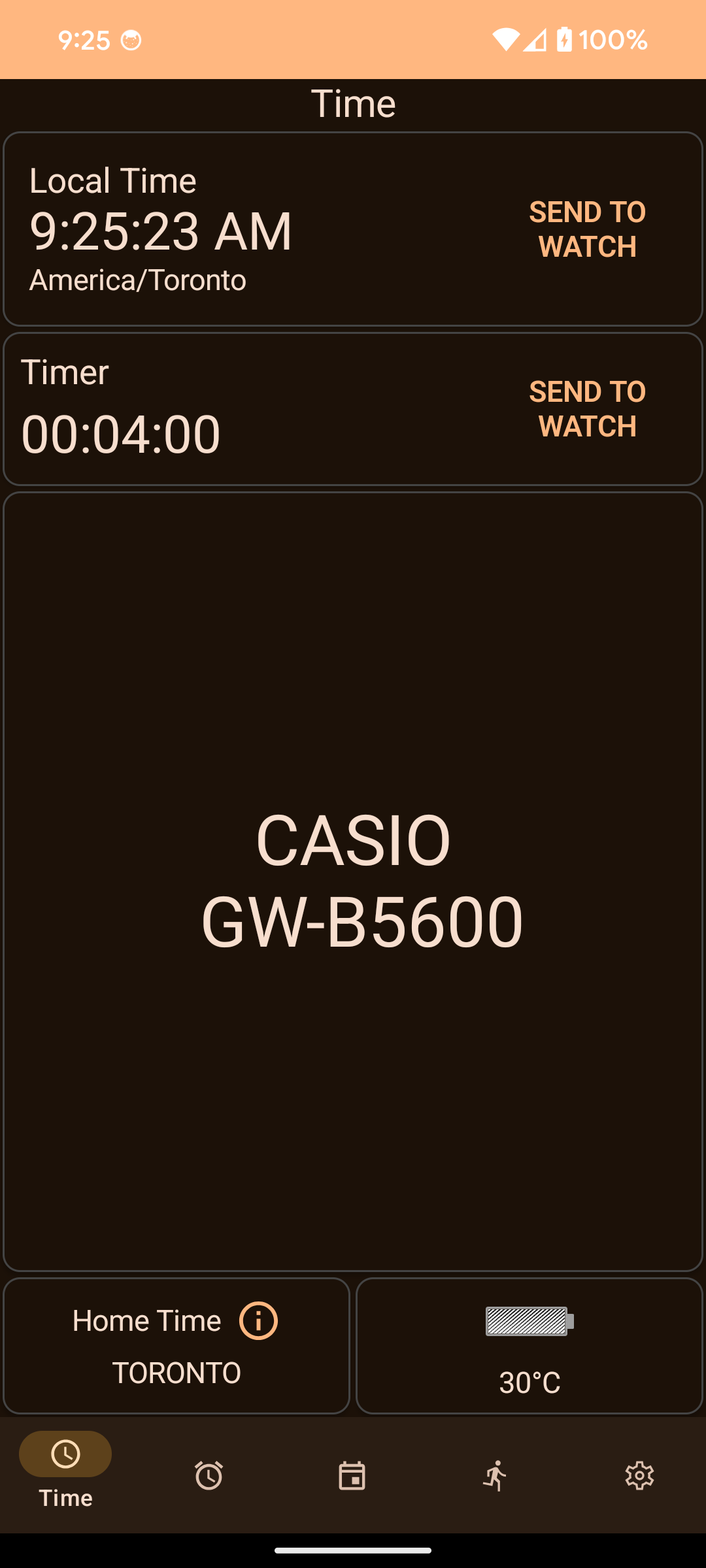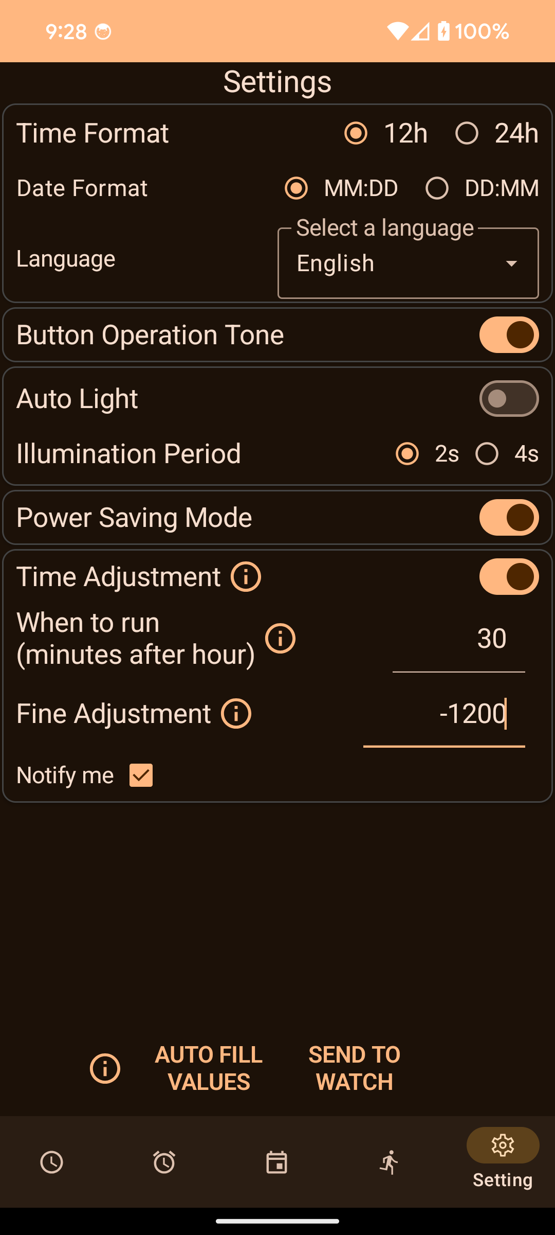 - Send to Watch: Tap the button to sync your phone's time, timezone, and DST settings to the watch immediately.