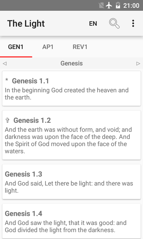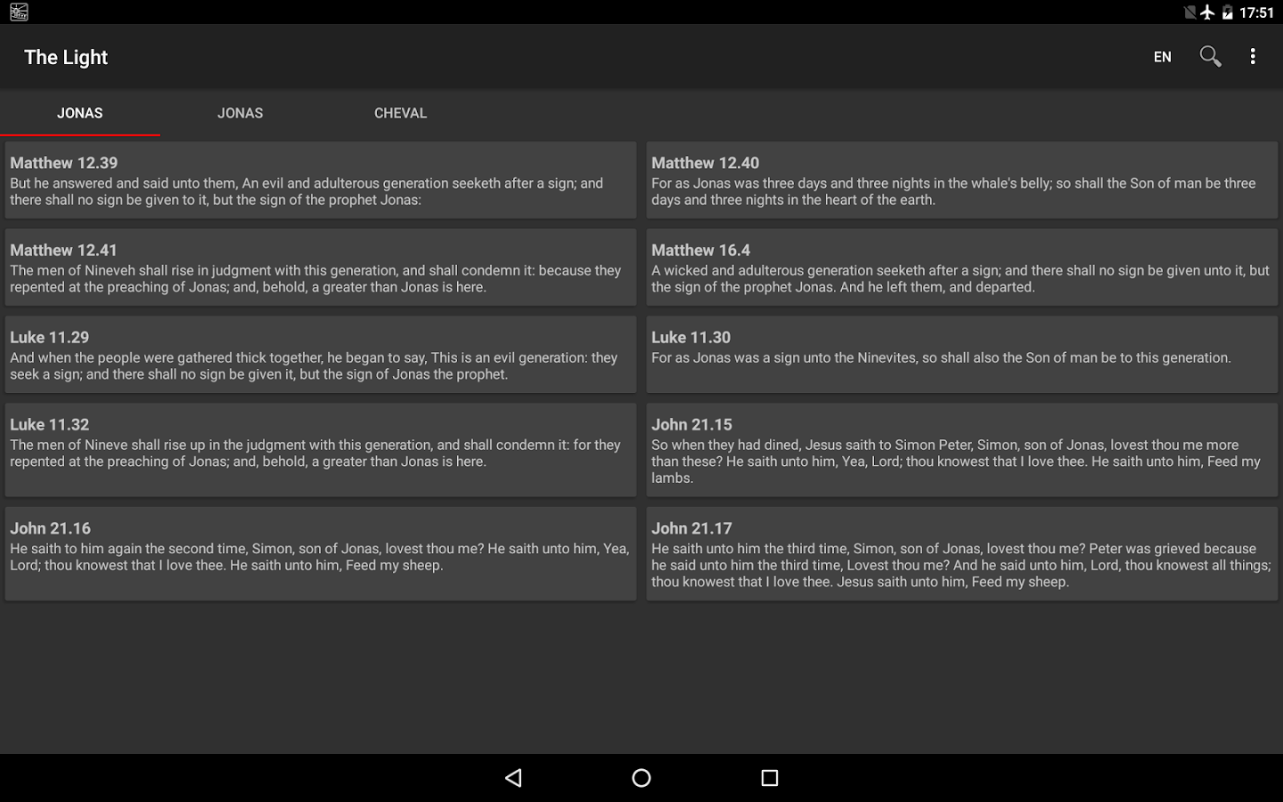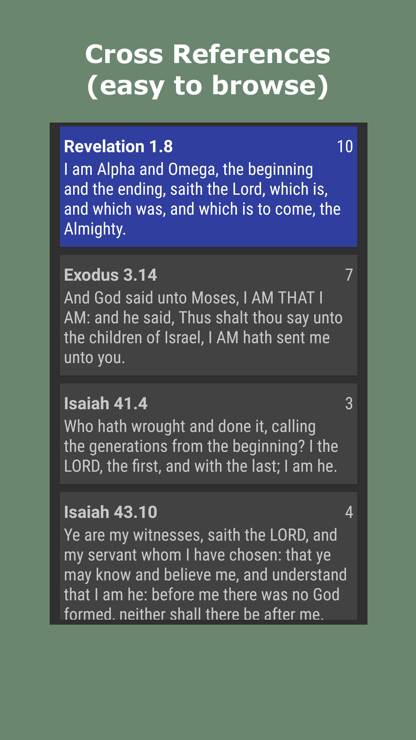 Easy to use with quick search and share, plans of reading, audio Bible, articles, cross-references, harmony of Gospels, random verses, interlinear (Strongs concordance in English).