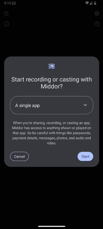 Middor only supports devices running Android 14 QPR2 or higher, as it relies on the single app screen sharing feature. For more details, see Android 14 - App Screen Sharing: https://developer.android.com/about/versions/14/features/app-screen-sharing