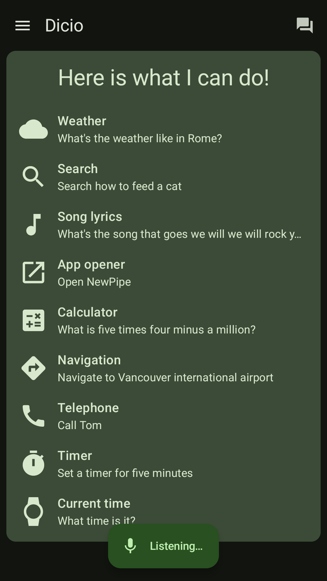 - navigation: opens the navigation app at the requested position - Take me to New York, fifteenth avenue