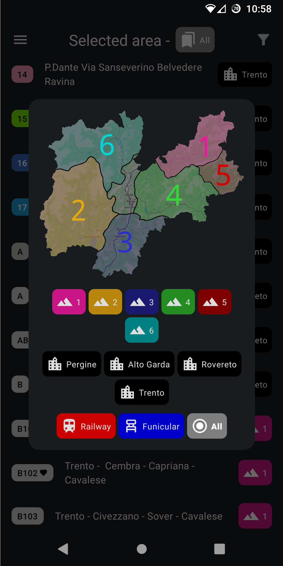- Lines: filter urban and suburban lines by area by choosing from a map of Trentino