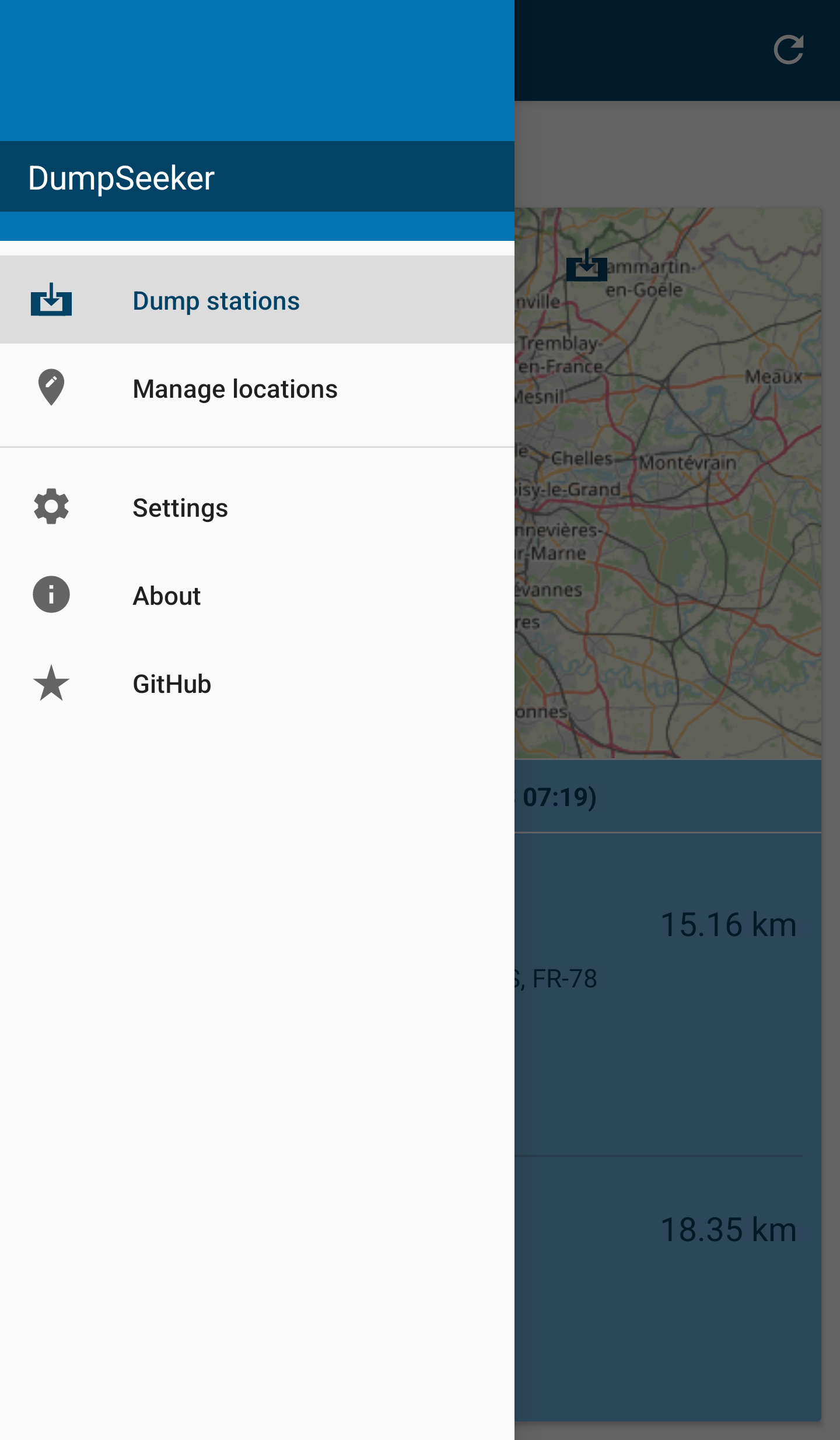 A long click on a station in the list will show the dump station in a map application.