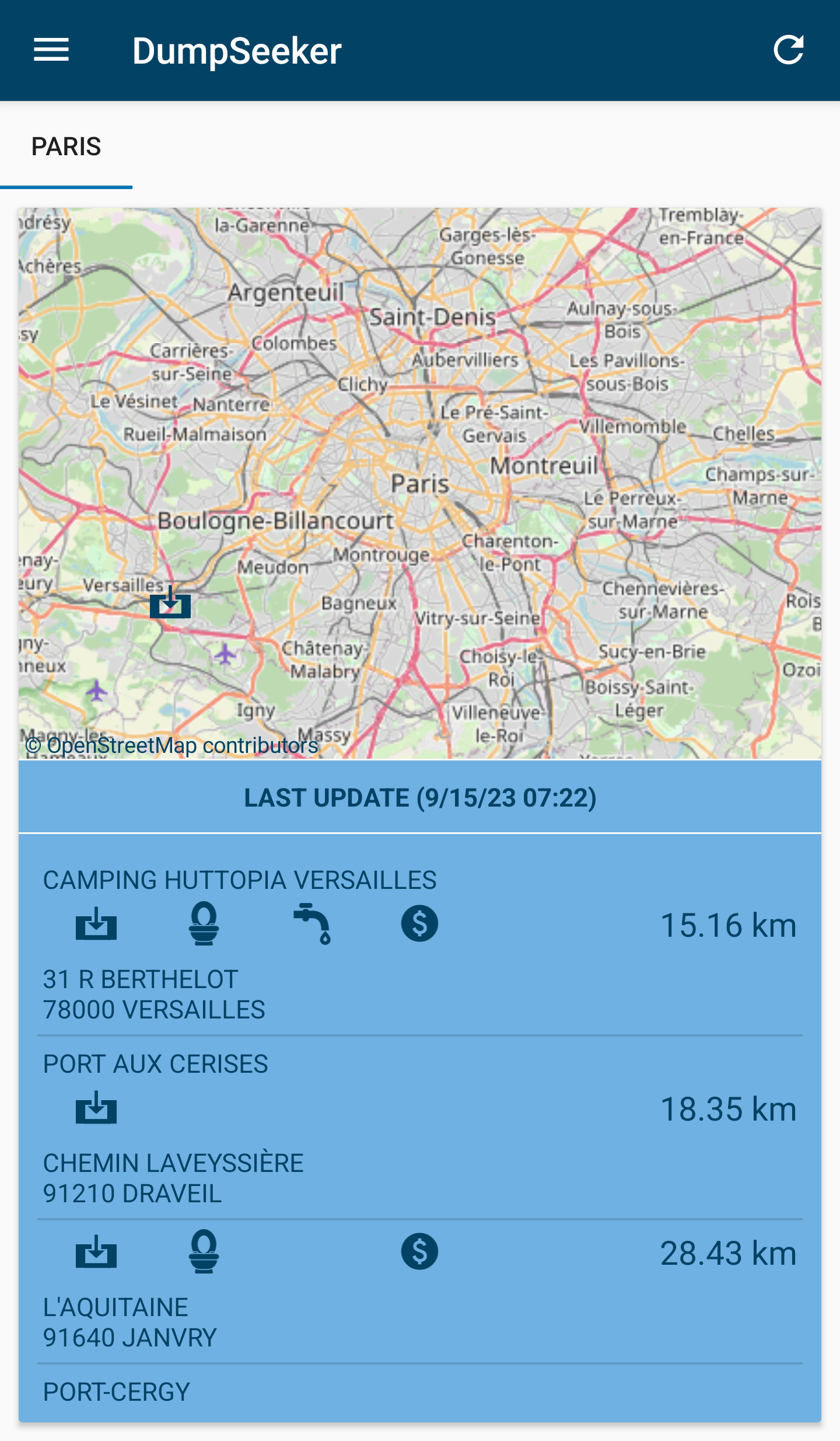 The dump stations for your current location are then displayed in the first tab in the app.