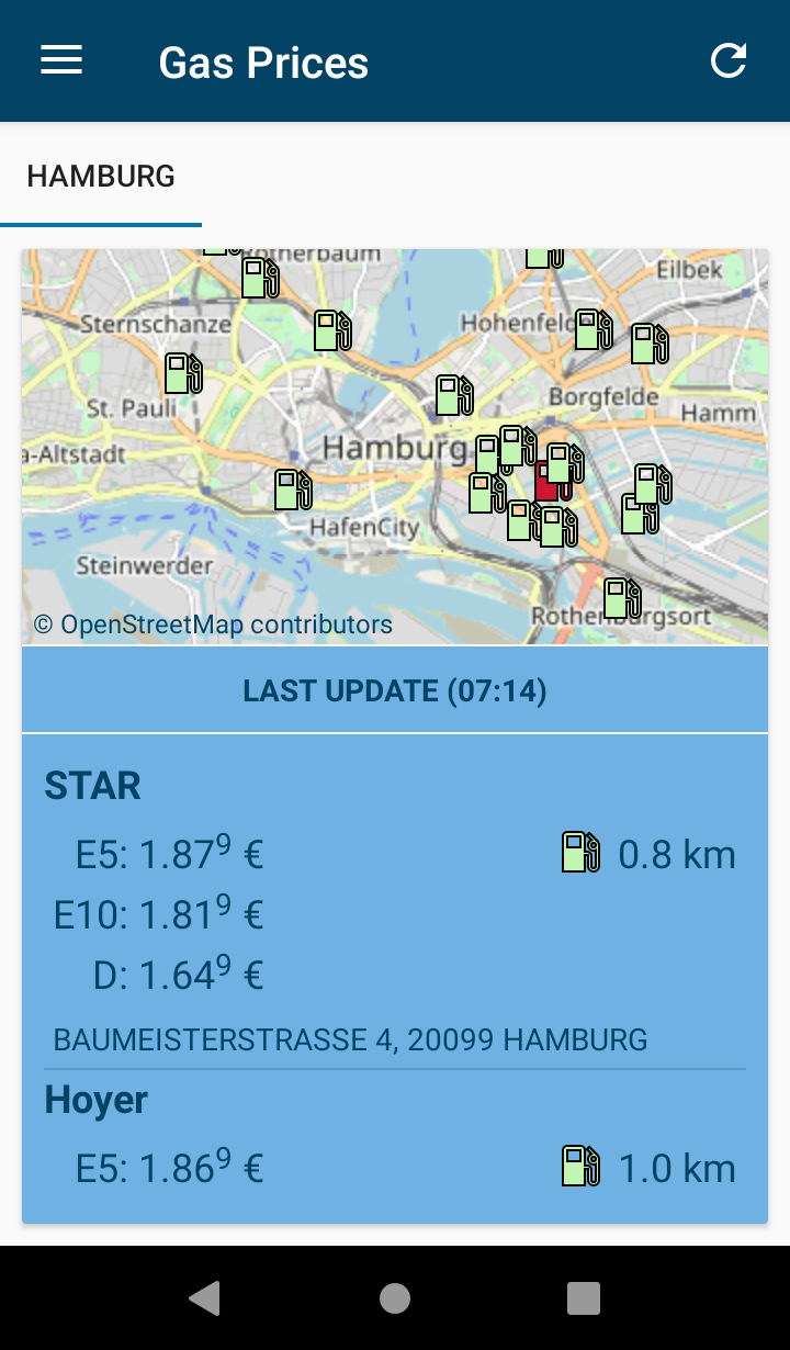 You can also allow the app to use GPS. If you do so and have the app widget installed the position will be updated from time to time and the first tab in the app and the widget will show gas stations for your current location. (This will overwrite the city in your first tab.)