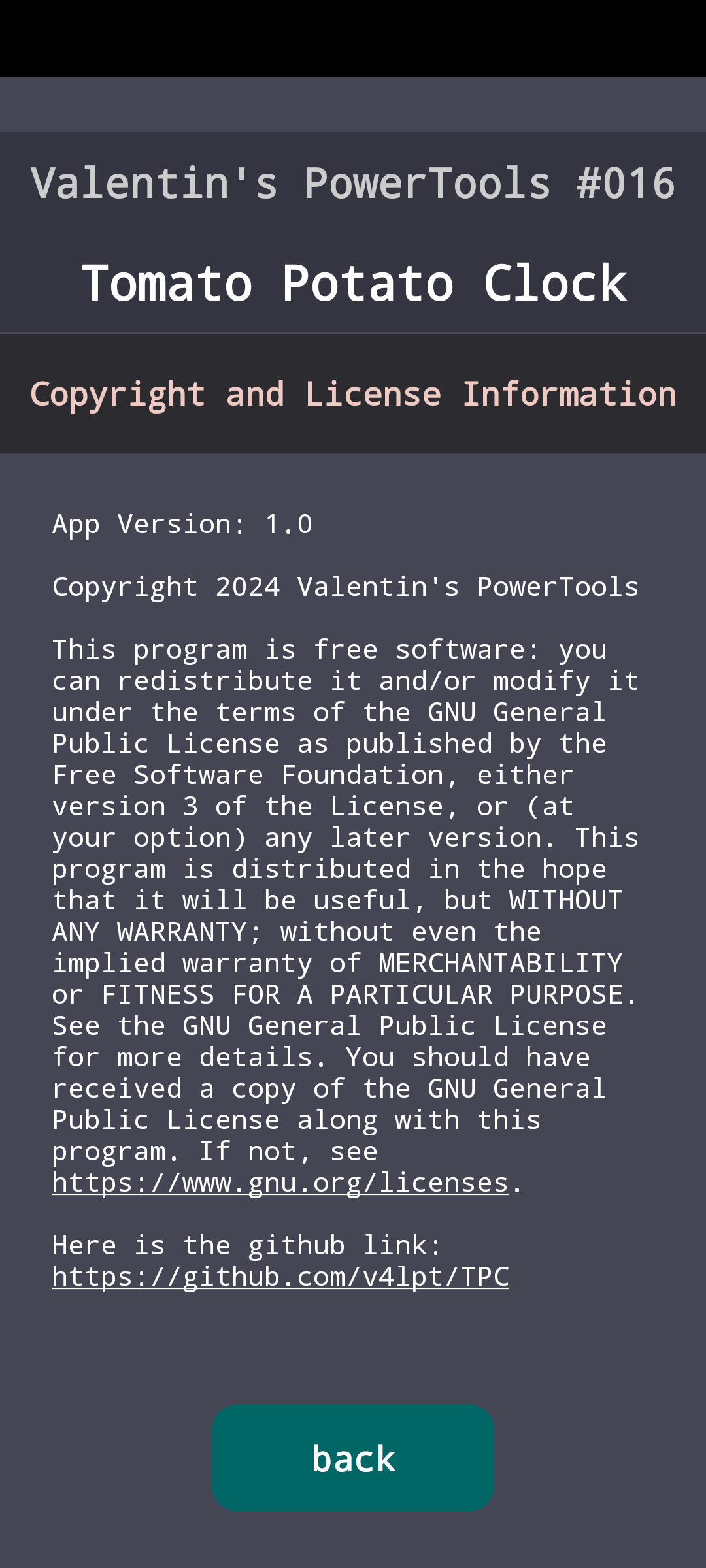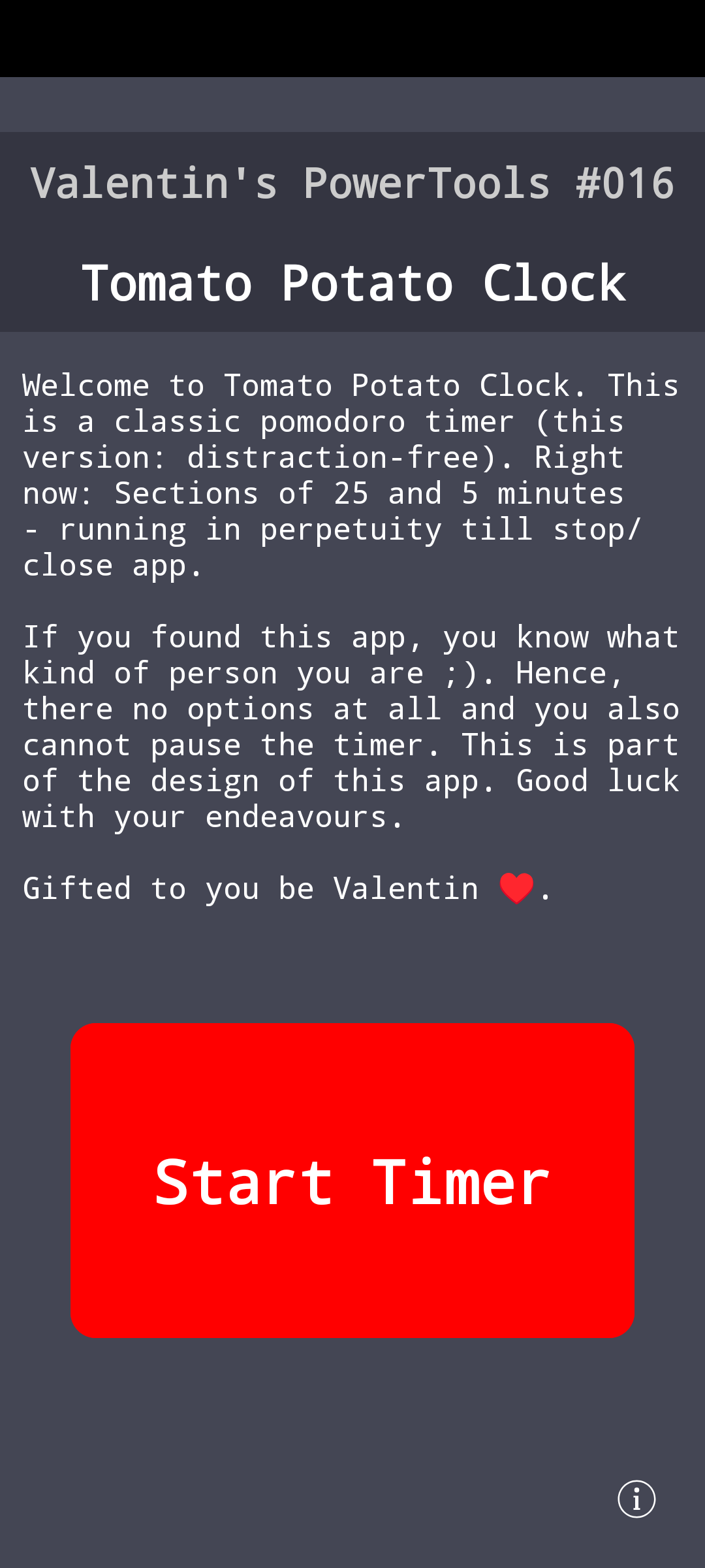 icon Welcome to Tomato Potato Clock. This is a classic pomodoro timer (this version: distraction-free). Right now: Alternating sections of 25 and 5 minutes - running in perpetuity (till stop/close app).