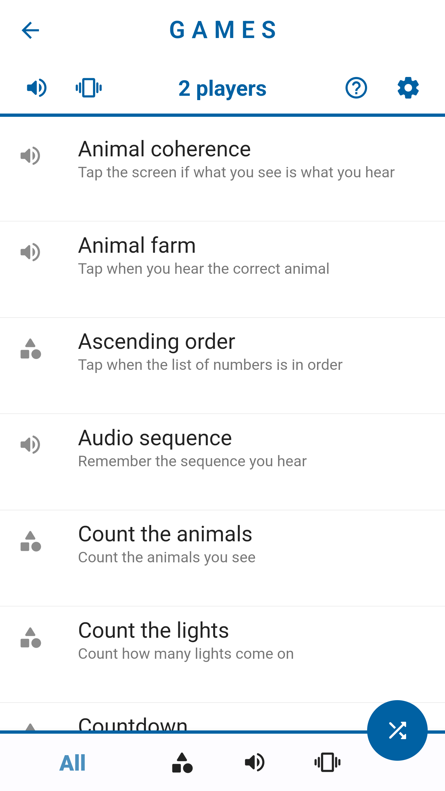 Audio: sound-based games, you have to listen carefully to find out the correct answer